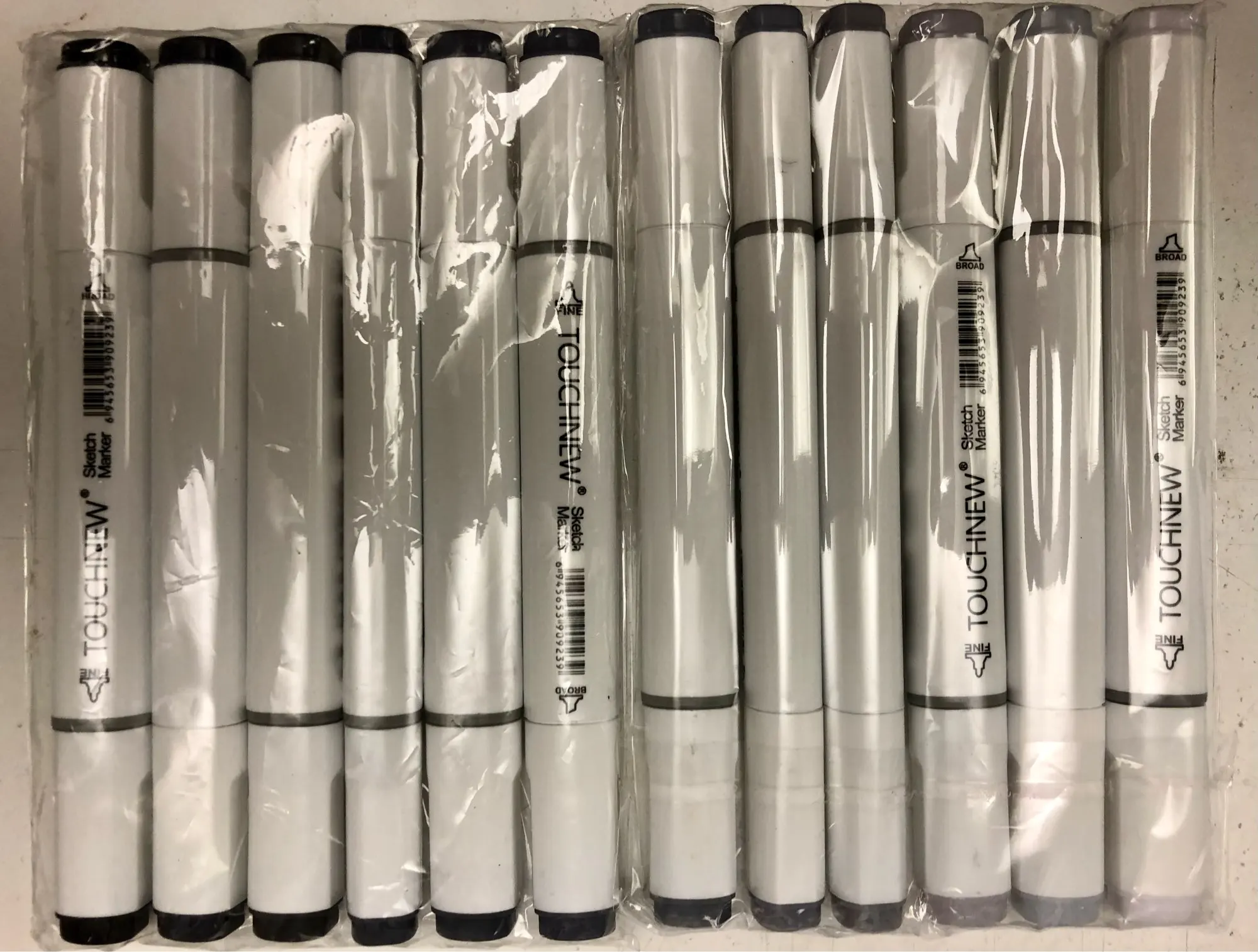 beautiful shades of greys. Very juicy. Great on all coloring book papers so far but beware on multi-media paper - very fast bleed on that paper. Comes with superfine black gel pen, regular writing size nib black marker and a 8mm white gel