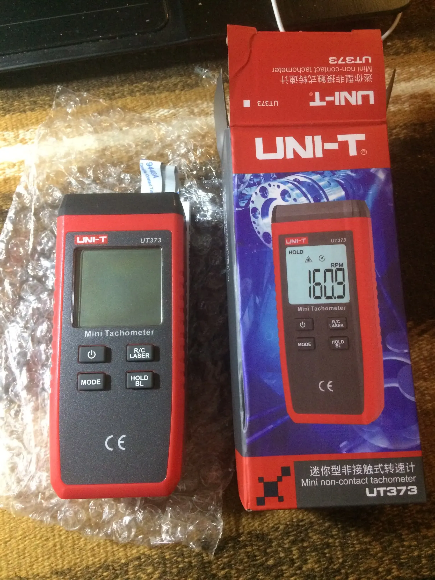 Got it, as stated without 3pcs AAA batteries. There was only chinese manual, I contacted seller for English, seller provided me link for english manual in pdf next day. Shortly tested the tachometer on blade saw and grinder. Accurate results you get, when you stick a reflective tape to blade and measure from distance of 10cm. If you put it closer, it measures reflection from blade and measurements are inaccurate.