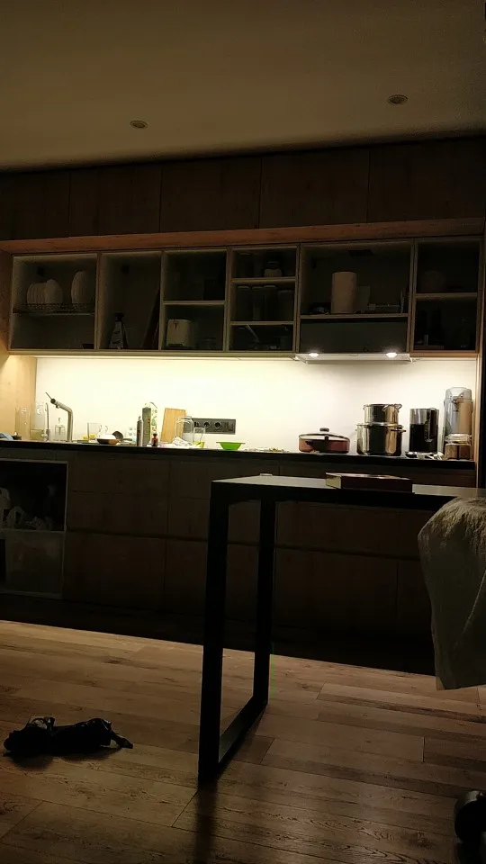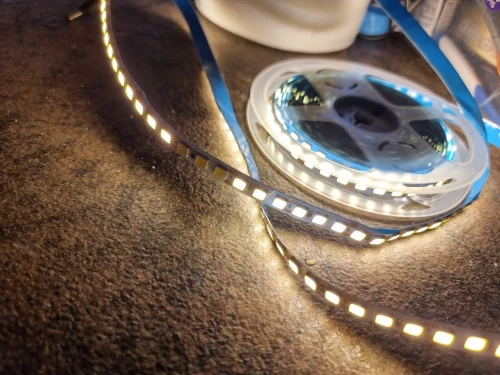 41W per 5 meter and quite bright. Perfect for the underneath in the kitchen.