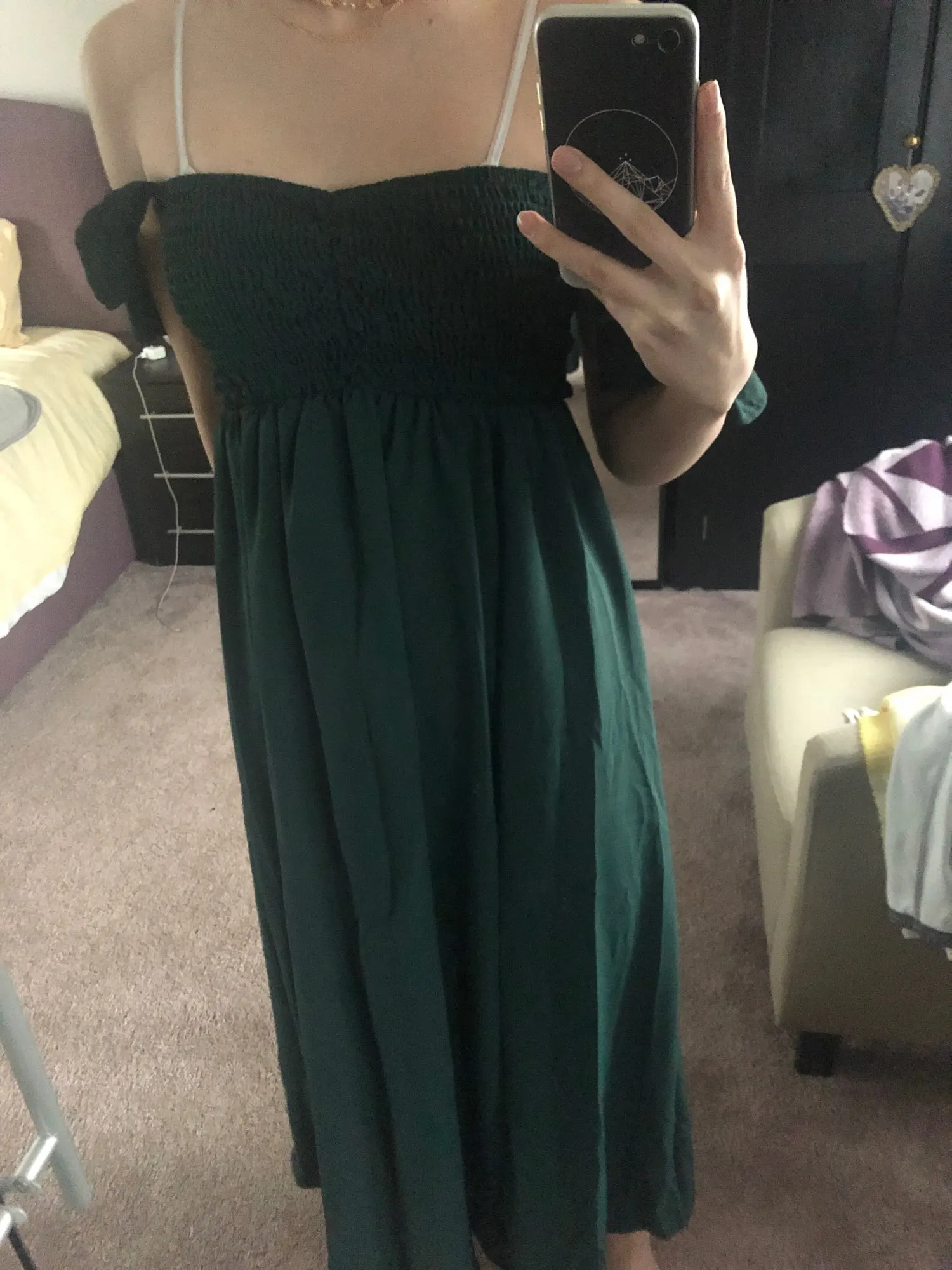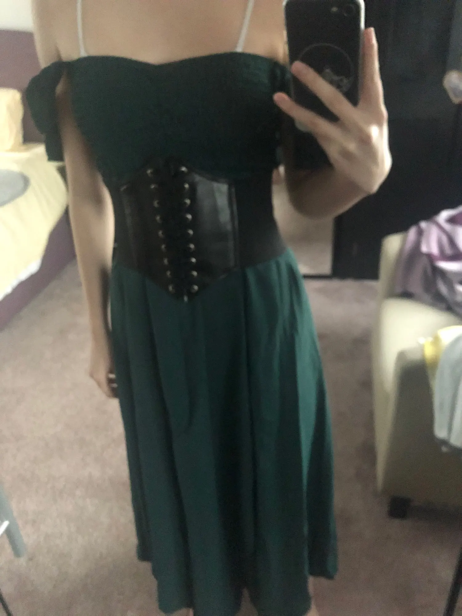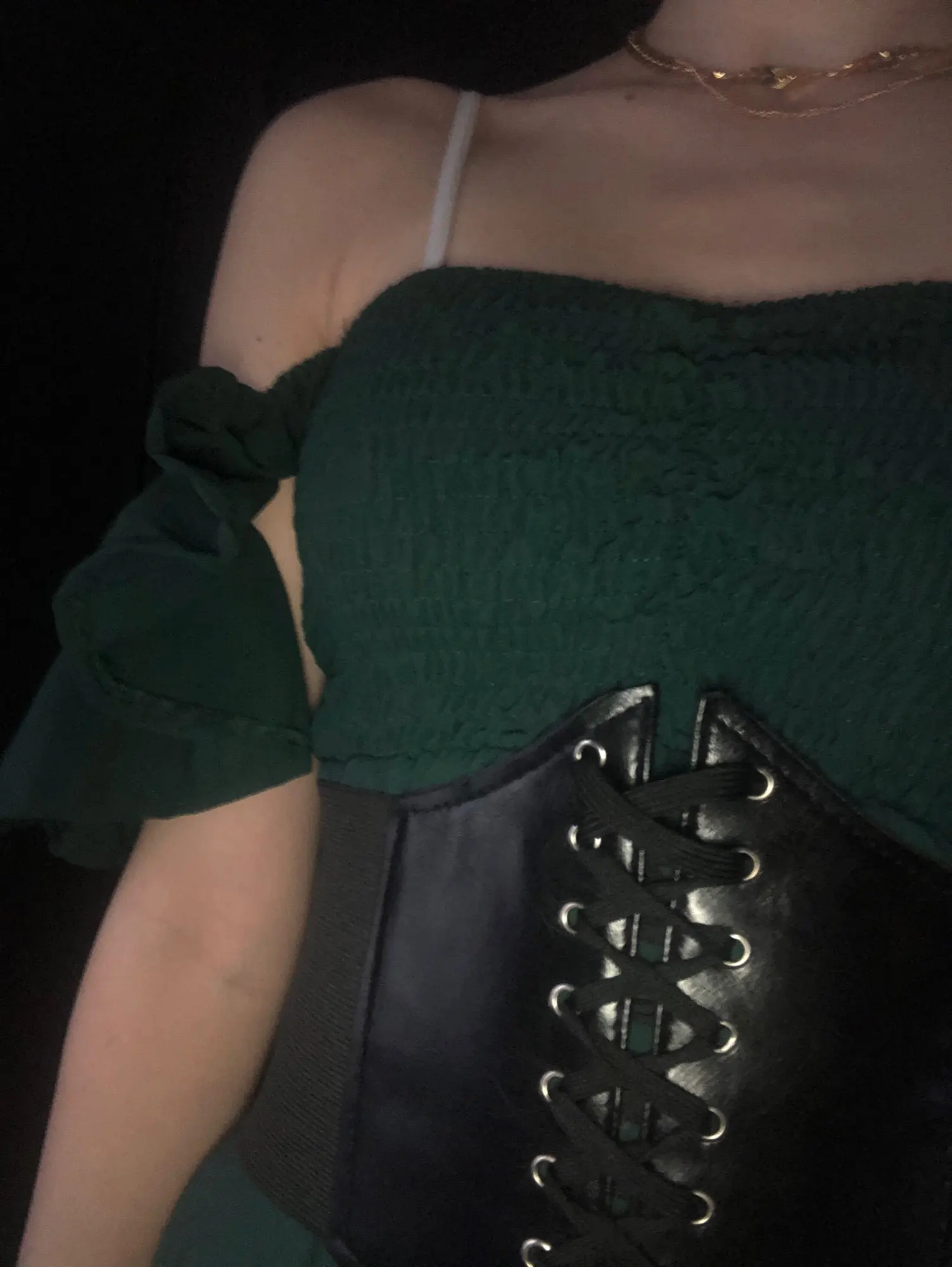 I was expecting the elastic green part to go as far as my waist but it only covers my bust. So I added a corset belt and it looks so much better. The material is very nice and not see through from what I’ve seen.