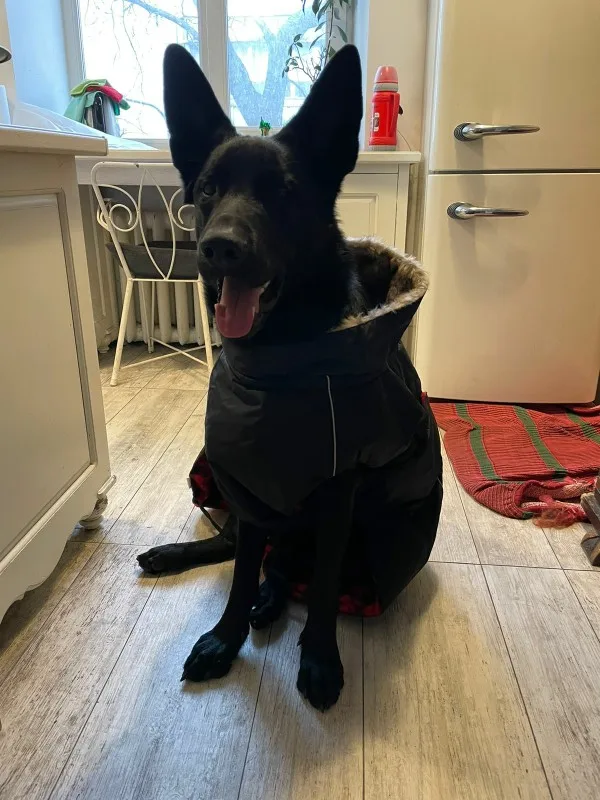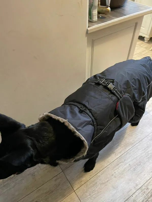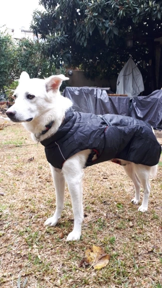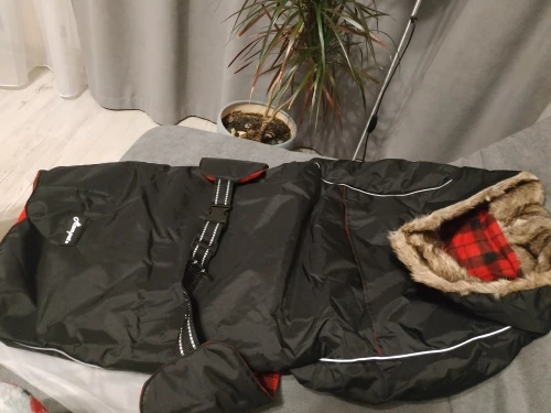 Fits dog very well. Looks warm and quality
