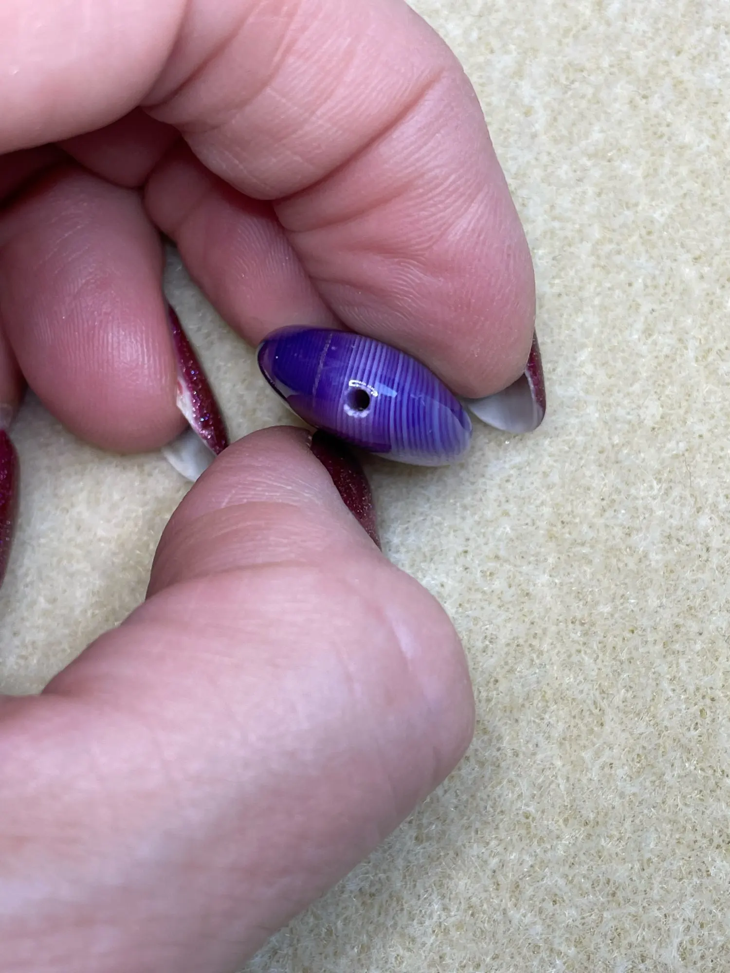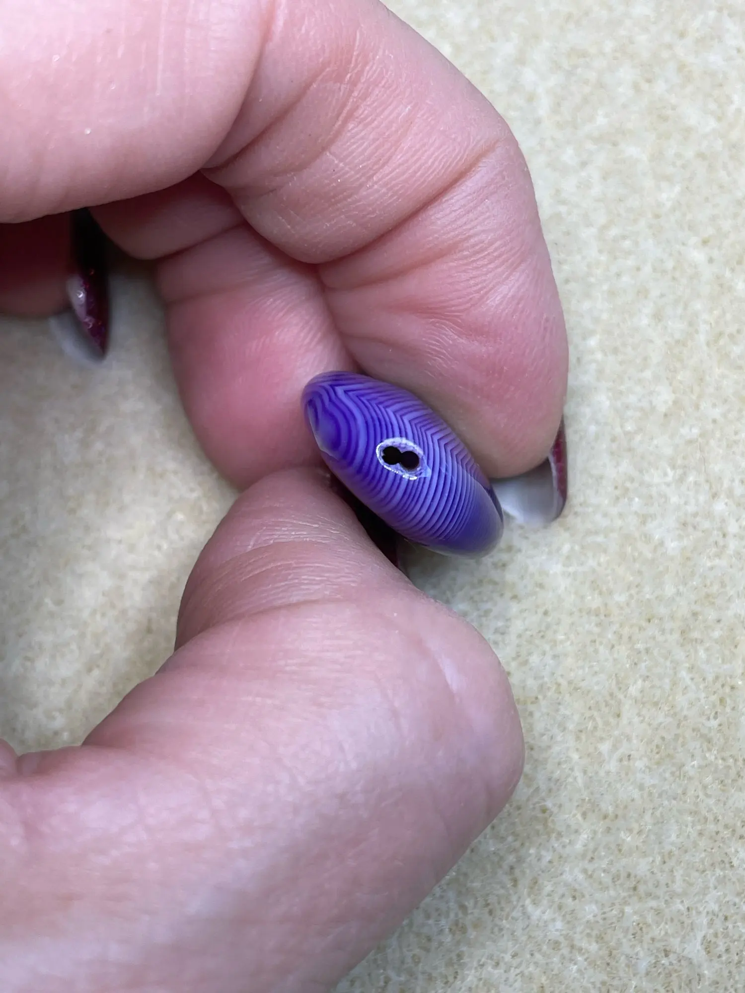 Colours not as deep or vibrant as expected but a pretty stone all the same. No problems with the hole.
