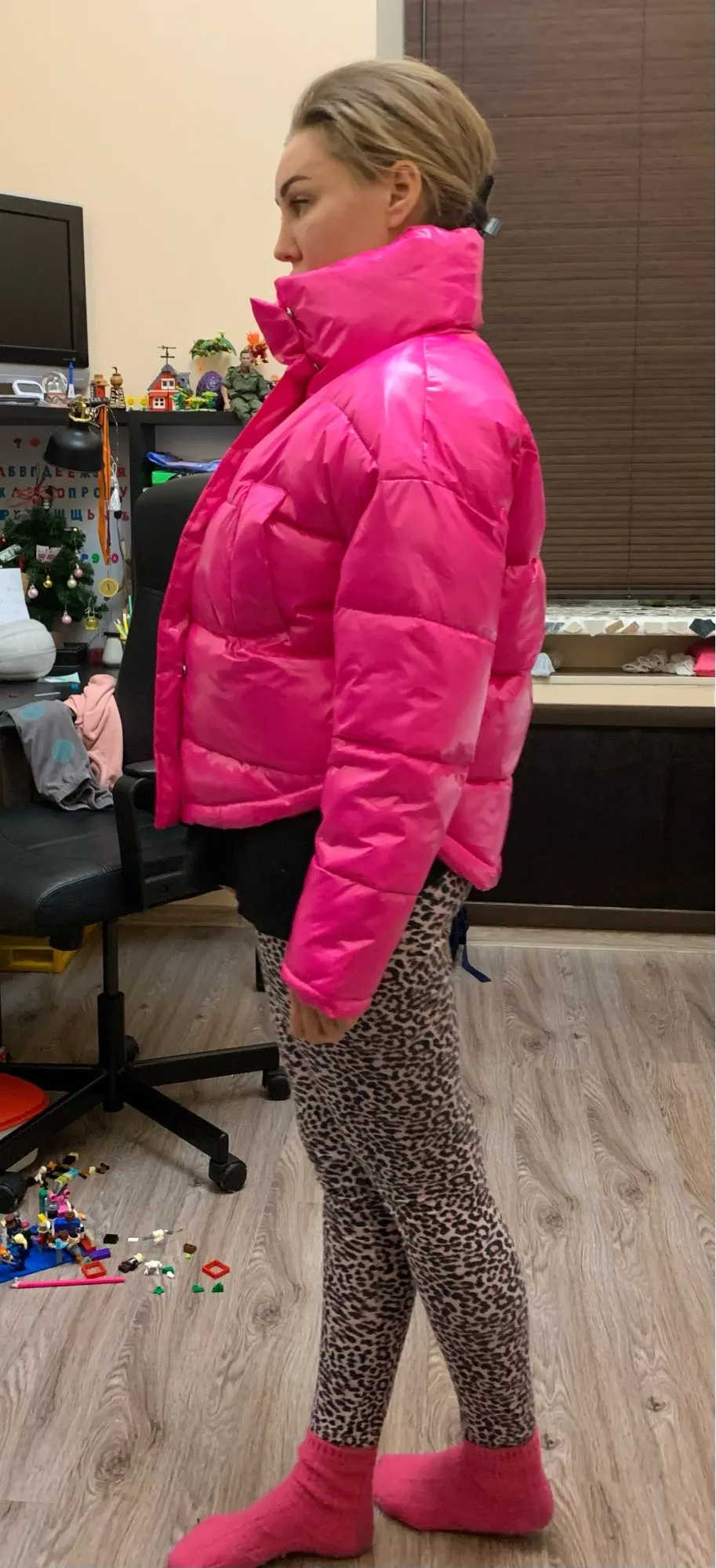 Same as picture. I am satisfied with the parcel! Nice jacket. Ordered Size S, fits perfect, my hight 163, weight 54kg. Delivery about month. Thank you!