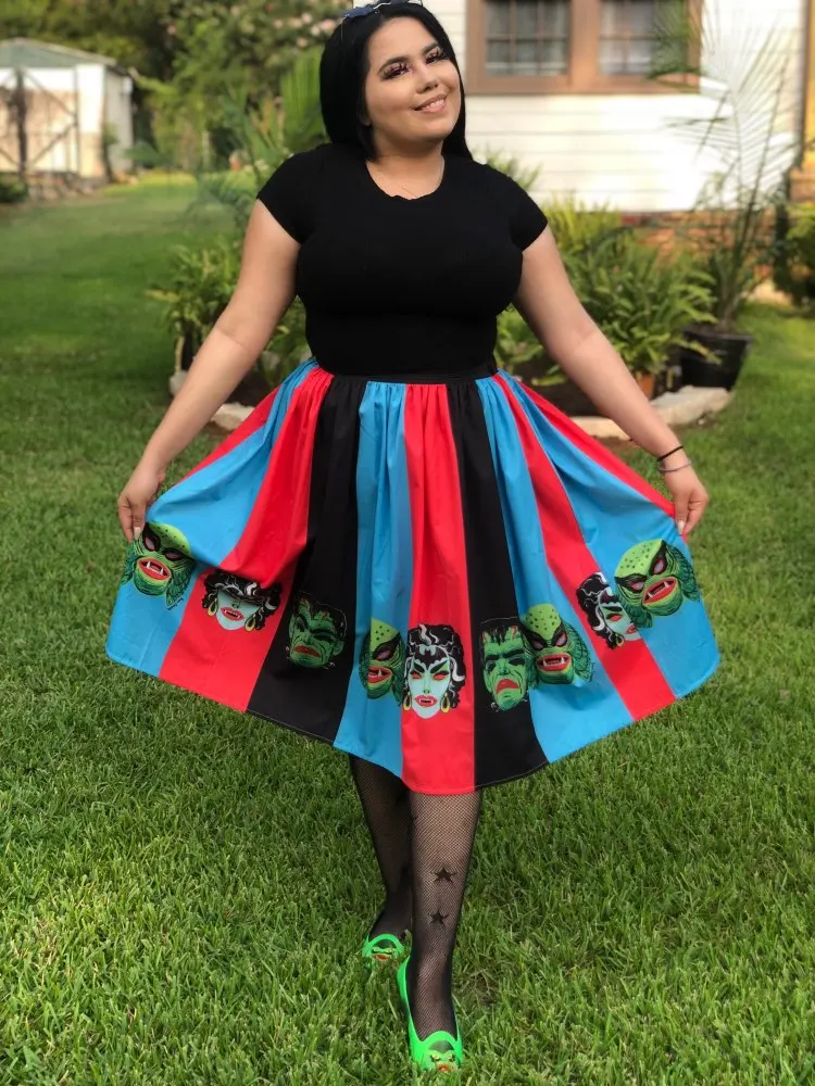 Women Vintage Halloween Skirt Retro Poker Face Skull Plus Size Skirt High Waist Pleated Ball Gown Long Skirts