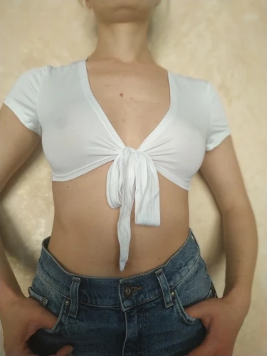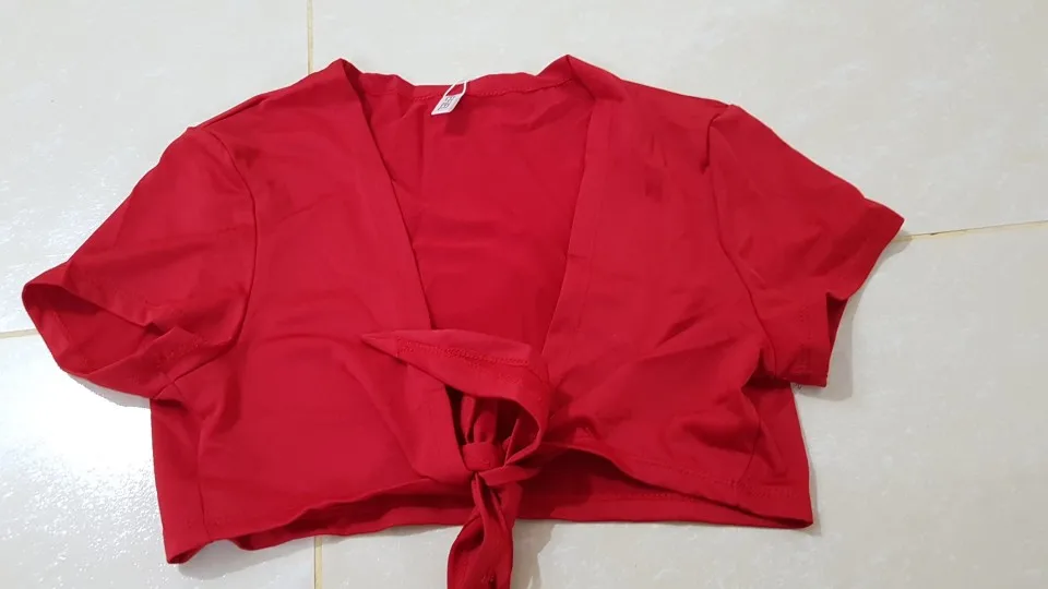 looks just like photo material is thin if you mess with it to much you might get a run in the shirt looks just like any other tie up Crop top with sleeves I thought it would be shorter than what it was it can be worn as a regular tie up top even with a bra too