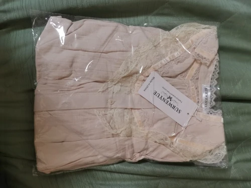 It arrived very quickly (before estimated time). It's a very nice beige blouse. The size fits me very well (even a bit on the big side). In the first photo it has like a pinkish tint. That's from the lighting. What I discovered is that it's collar is wider than I expected it to be. Other than that: A very nice product.