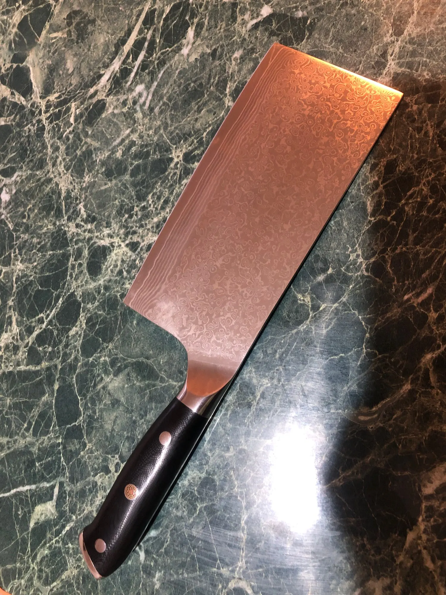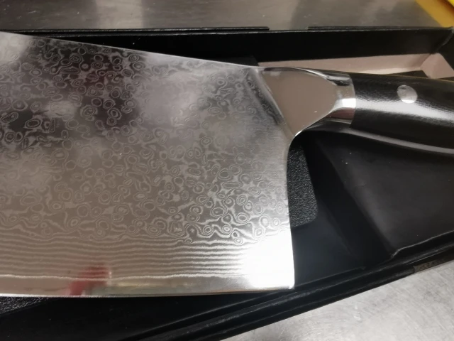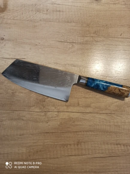 Got my knife today. Looks pretty much exactly like the seller's photos, so I won't bother uploading a picture here. First impressions are very good, the knife came sharp enough to shave with, and looks fantastic. Handle is comfortable to hold. Balance leans towards the blade but that's how I like it. Let's see how well it performs in day-to-day cooking.