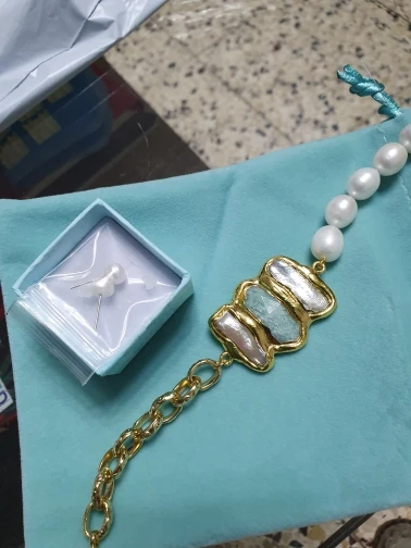 Y.YING natural Cultured White Rice Pearl Amazonite Biwa Pearl Chain Bracelet 8" vintage style for women