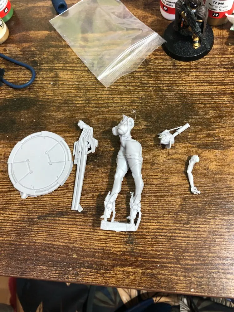 Bonita figura Buena calidad. Alguna pequeña rebaba. 5 piezas. Peana, cuerpo, brazo con el arma, cabeza y brazo