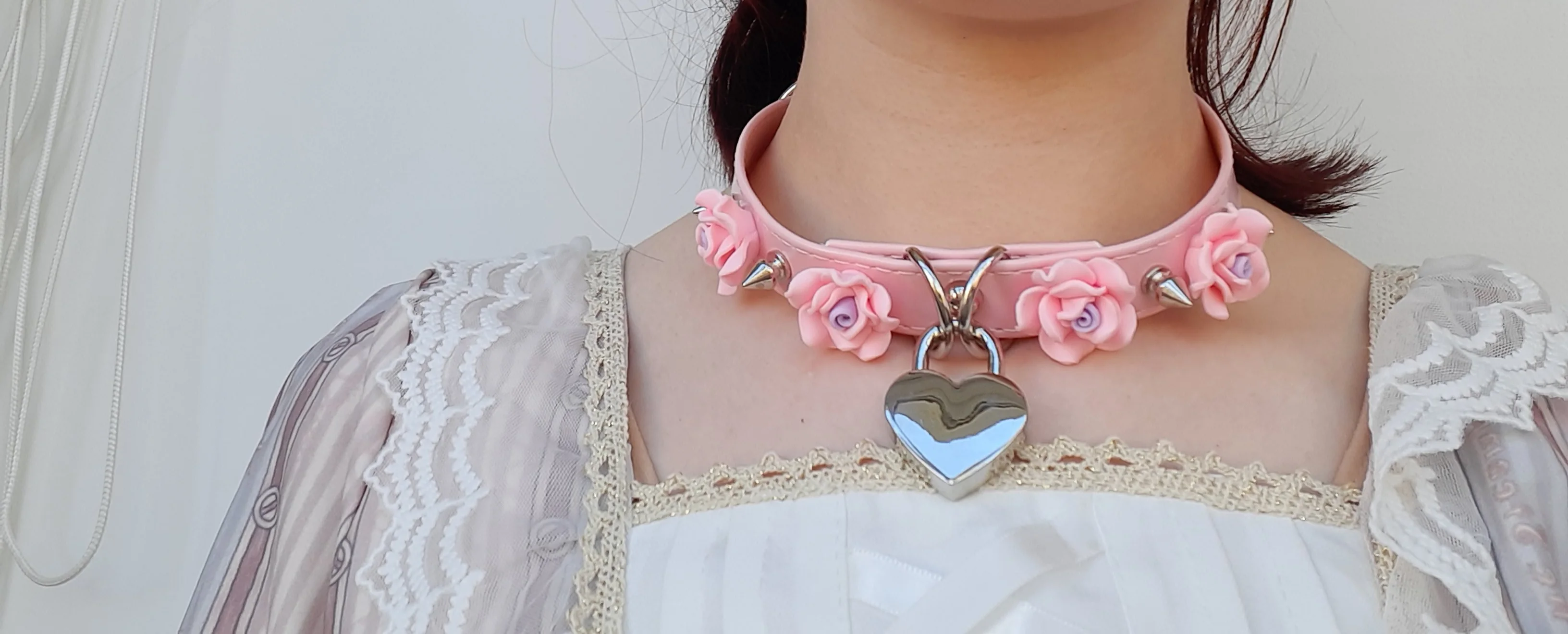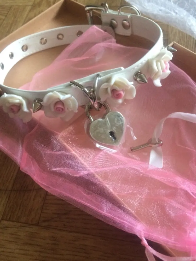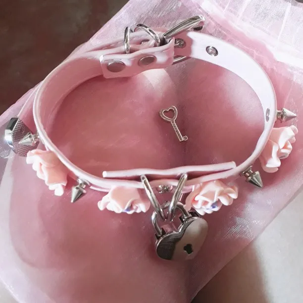 100% Kawaii Harajuku hecho a mano, seguro, corazón con cerradura con llave, Gargantilla de flores rosas, Collar con púas, Collar con hebilla