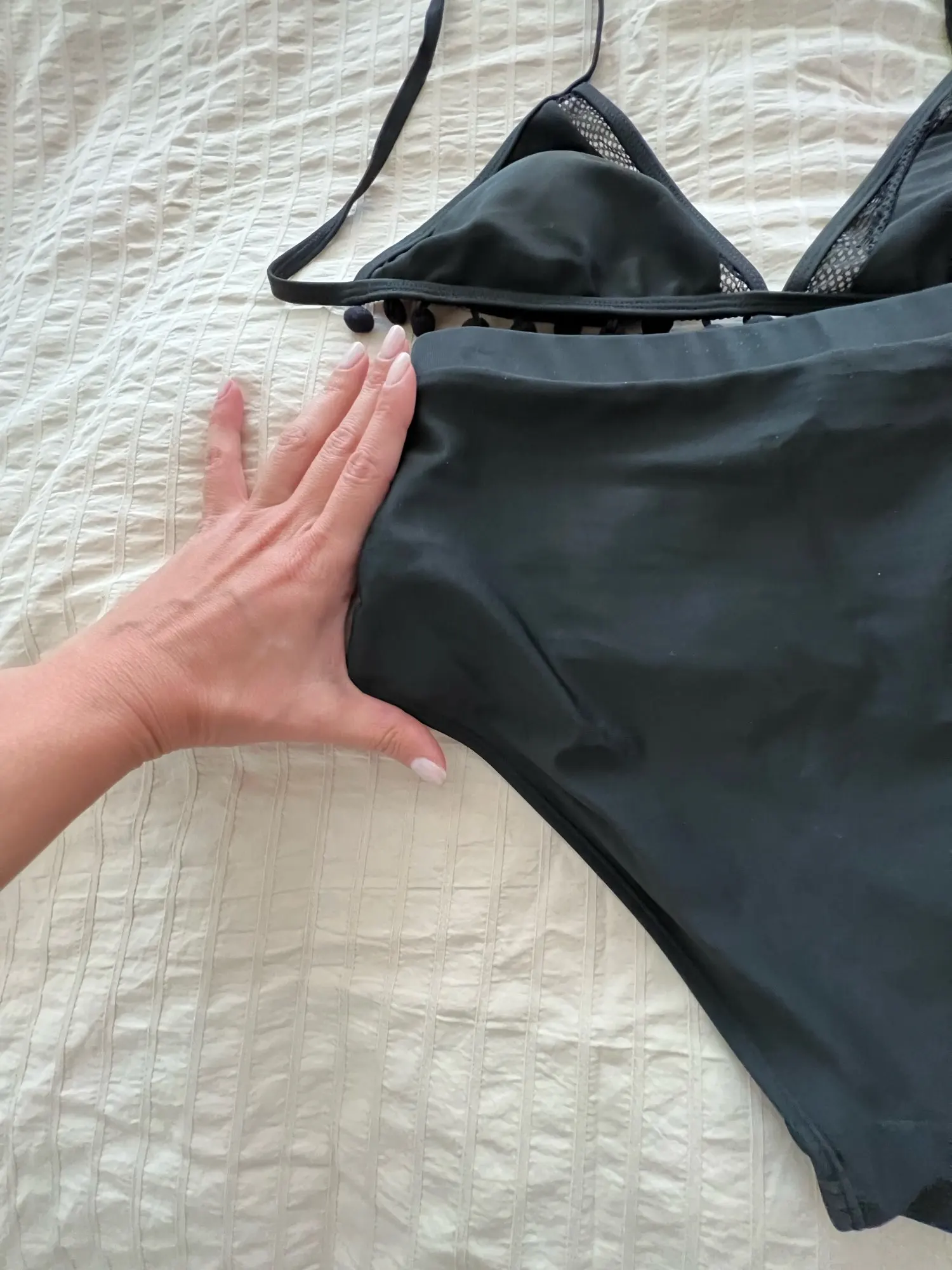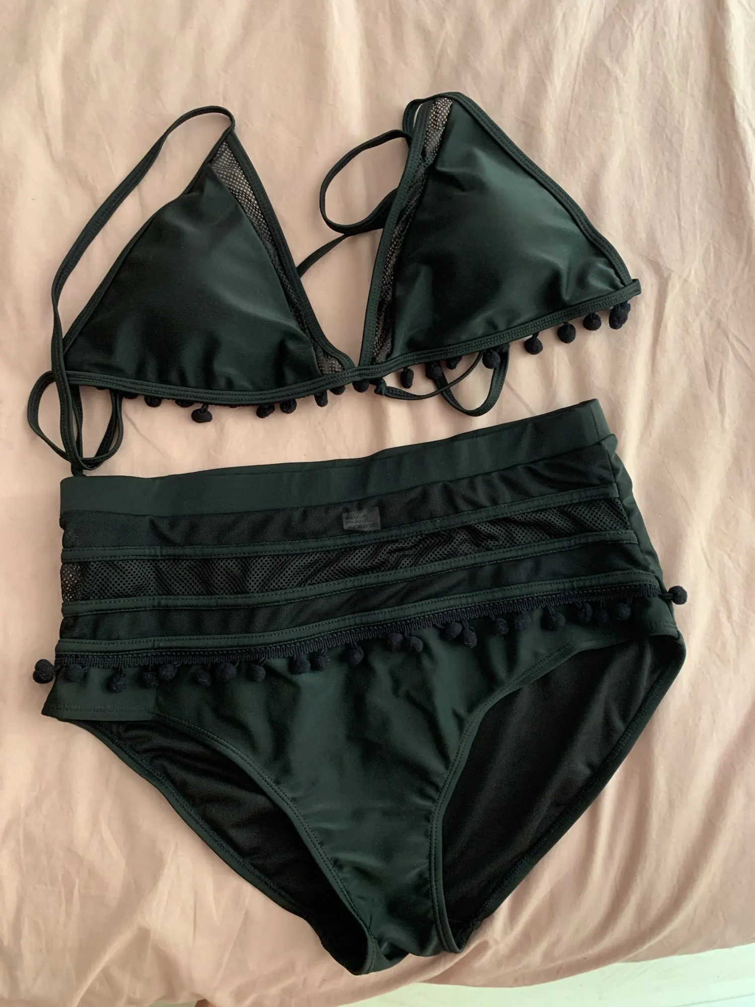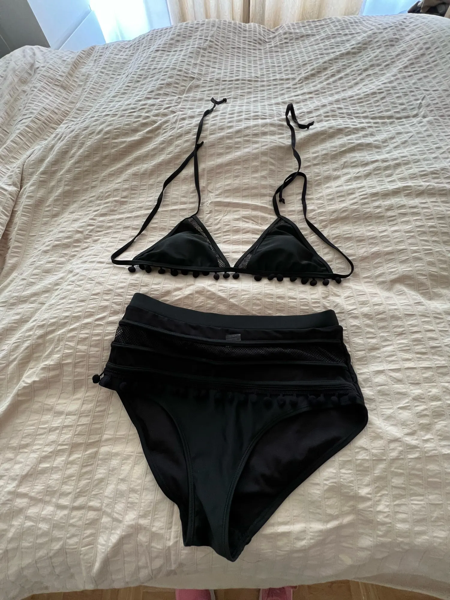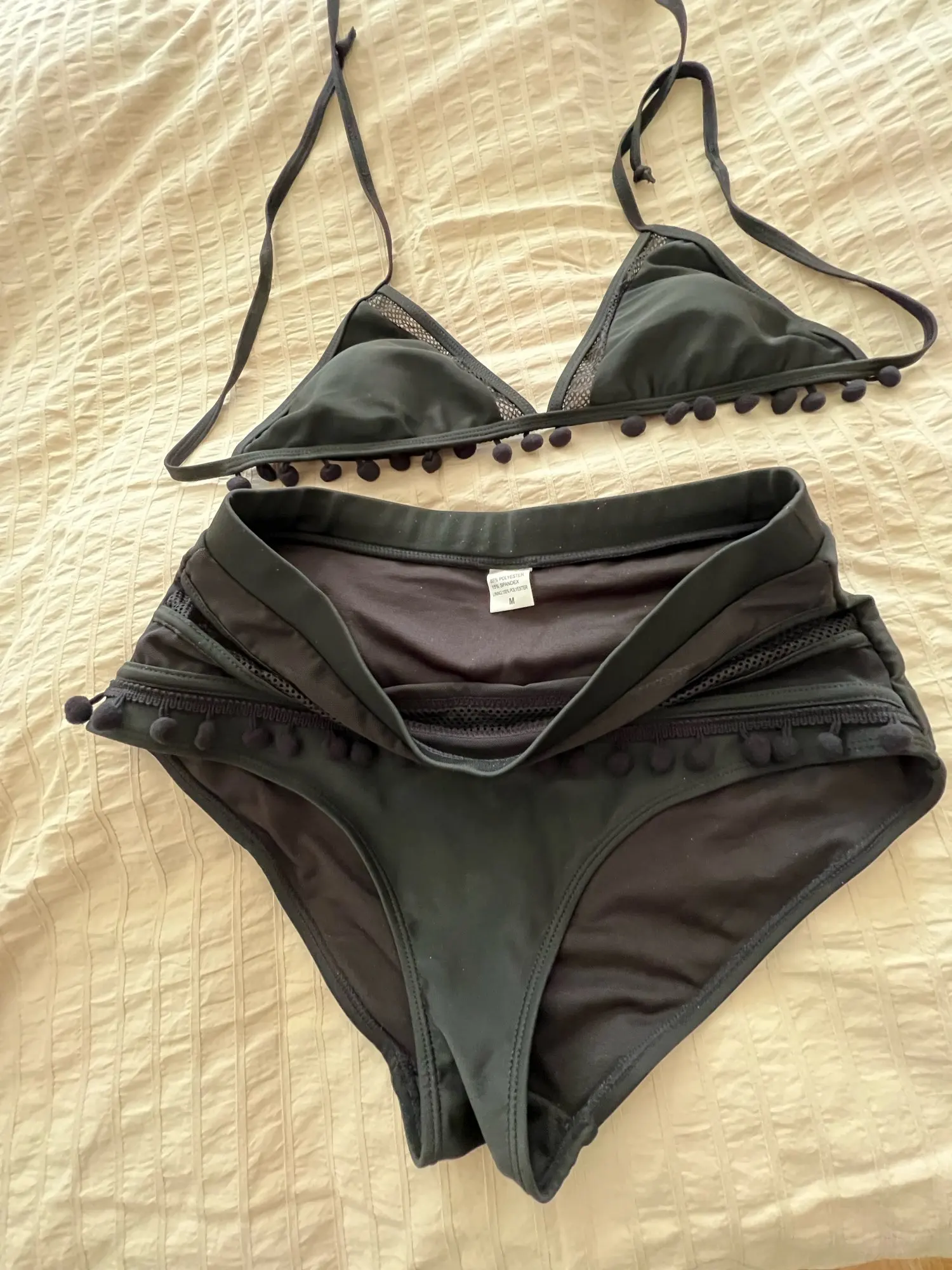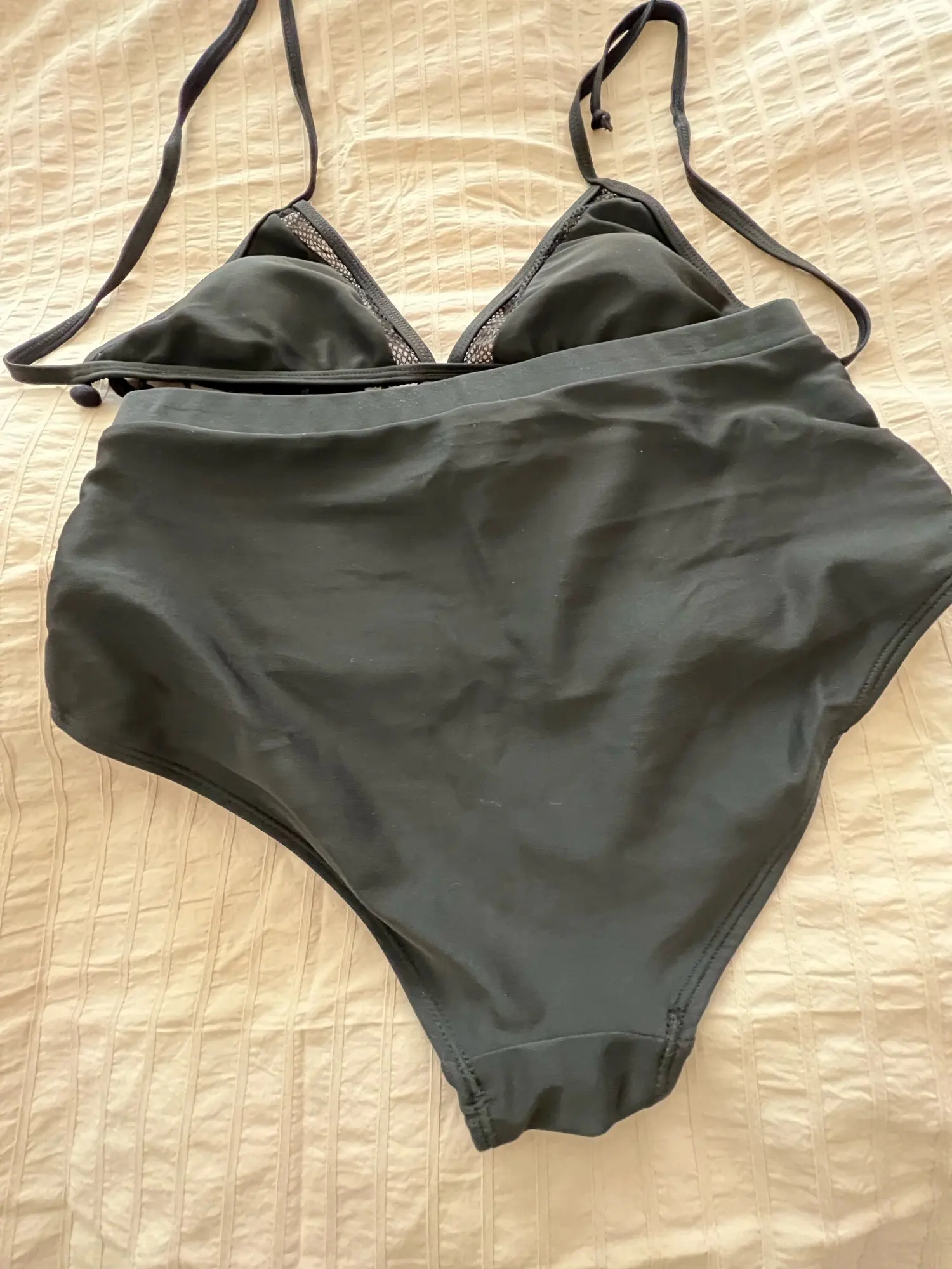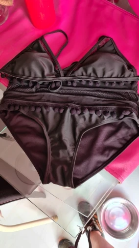 Producto igual a la imagen, la talla corresponde a las medidas que describen. El calzón atrás es grande, no es rebajado. La parte de arriba tiene unas almohadillas por dentro y es ajustable en la espalda y el cuello, pero el sostén es fijo, no es ajustable. Llegó muy rápido y las terminaciones son lindas, la tela y las costuras se ven de buena calidad.