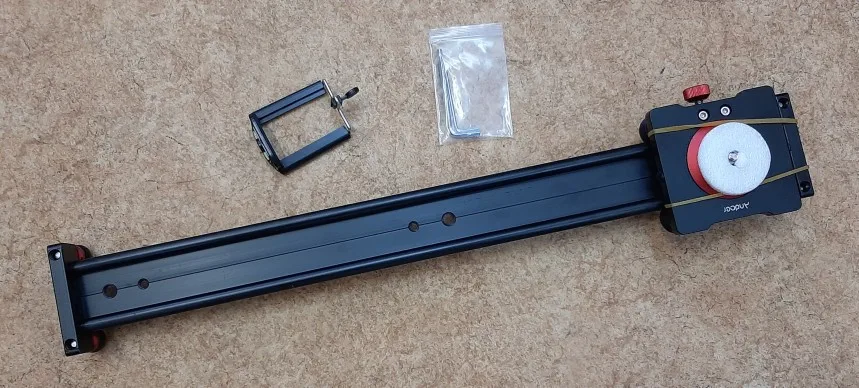 Slider de aluminio, se desliza muy facilmente. Tiene varios sitios donde atornillar una base fija o lo que queramos.