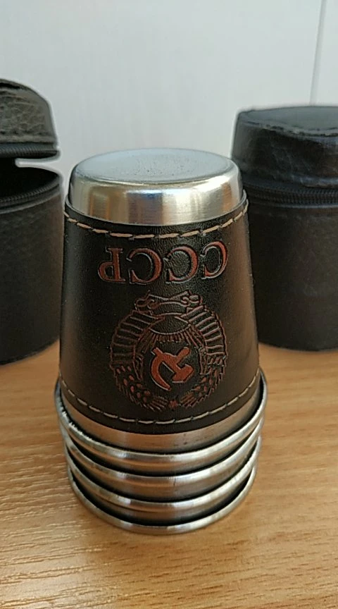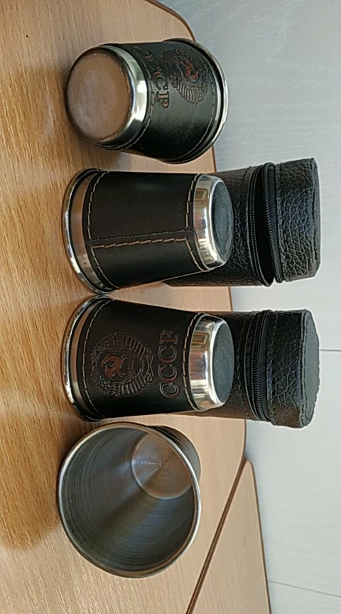 4 unids/lote 70ML Camping tazas Acero inoxidable al aire libre de viaje portátil taza de cerveza de vino café whisky taza de cuero de la PU de Picnic vajilla
