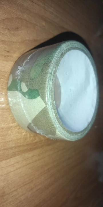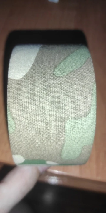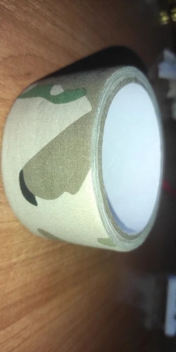 Muy buena cinta. Es de tela, pega bien sobre plastico pero muy poco sobre ella misma. El esquema del camuflaje quiza es un poco demasiado "amplio" para el tamaño de la cinta, dependiendo sobre que la vayas a poner.