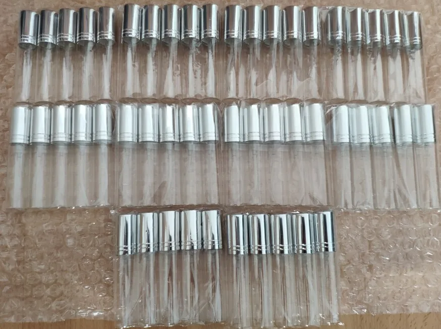 50 unids/lote 5ML 10ML botella de Perfume de vidrio transparente fina botella de Spray de vidrio frascos de tubo para viajes