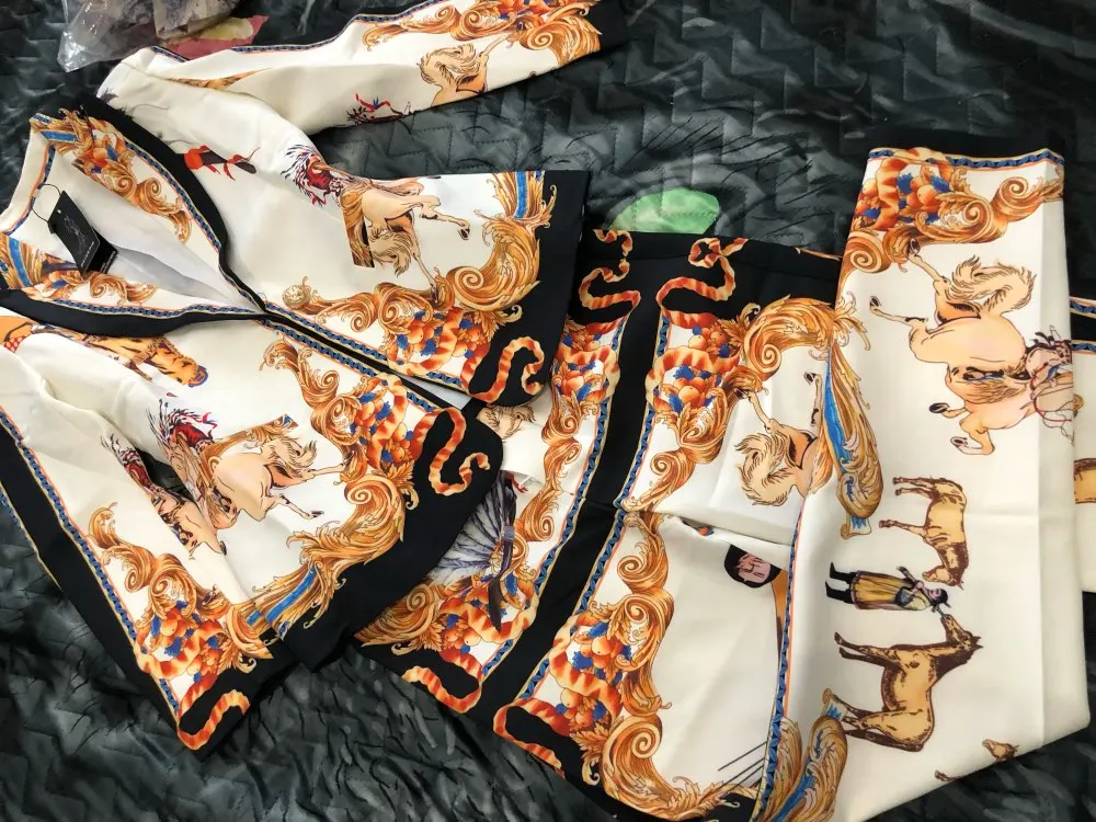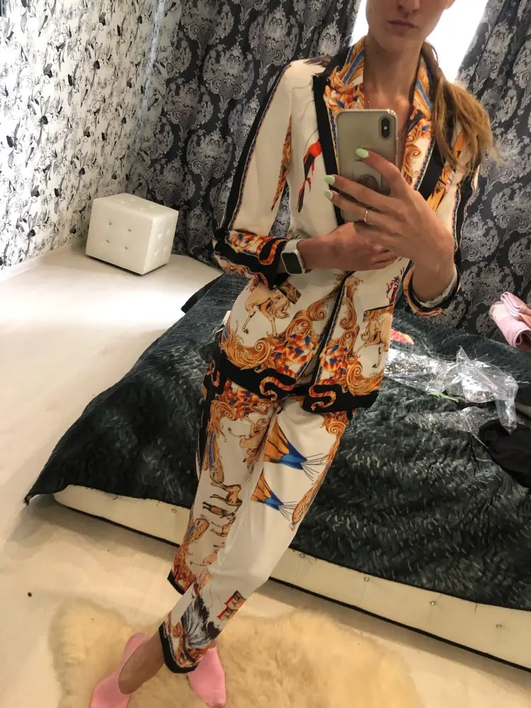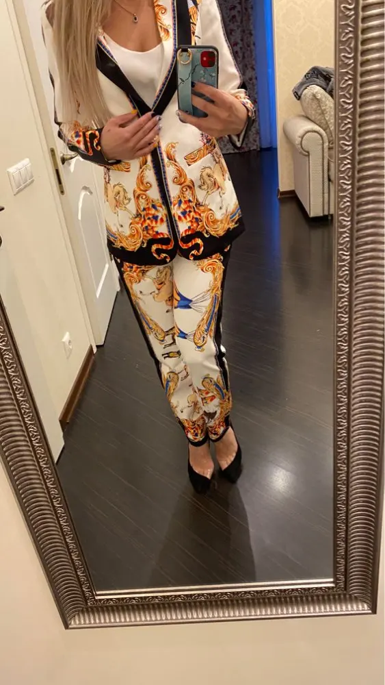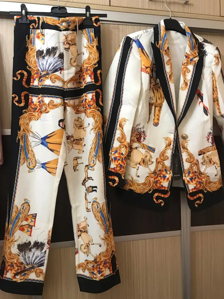 Alta calidad de diseño mujeres pantalones Vintage trajes solo botón chaqueta delgada pantalones pista impresión dos piezas conjuntos trajes