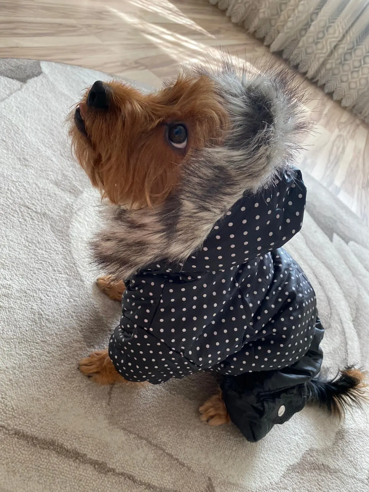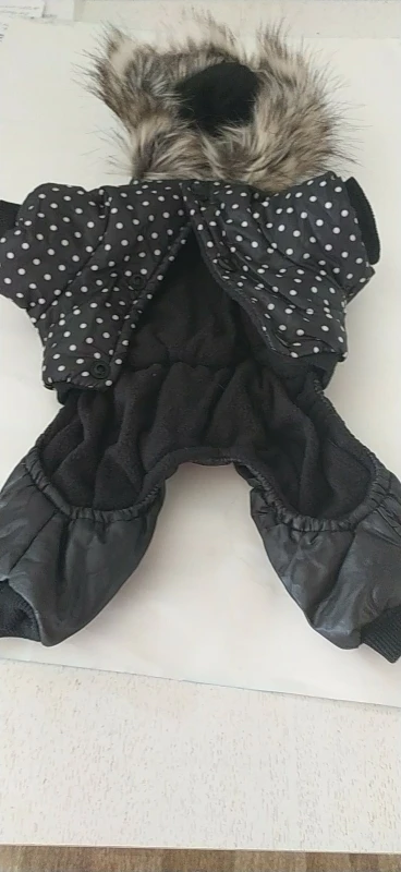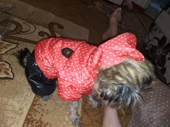 La calidad es muy buena. Pedí la talla S para mi chiguagua de 1400 kg. Le va un poco grande las patas muy largas pero le hago un dobladillo y lo puede llevar bien.