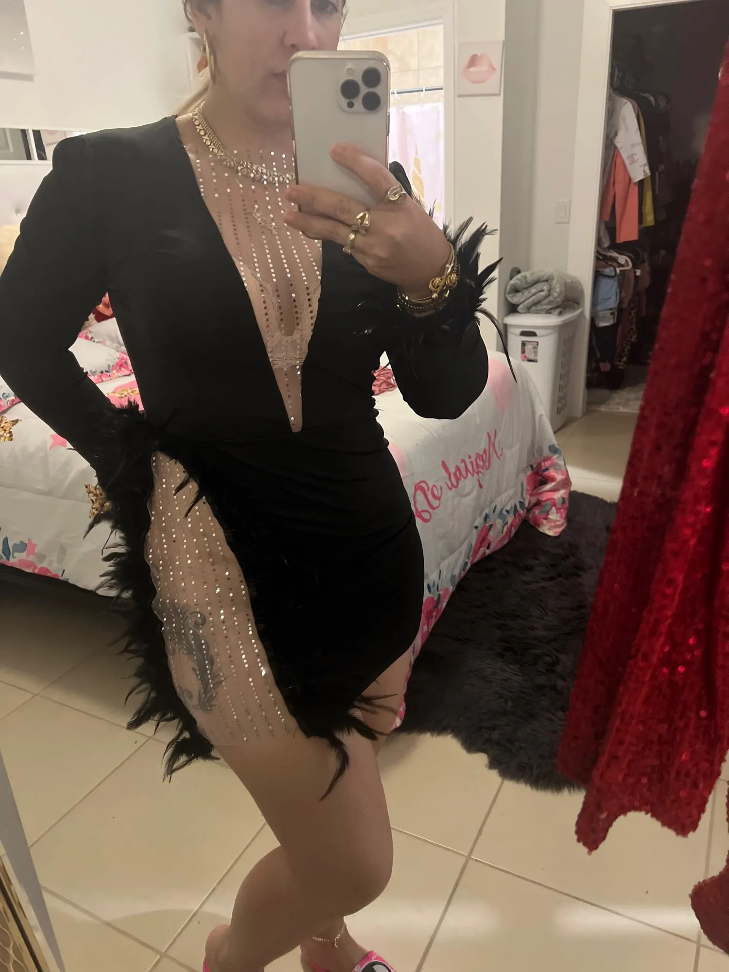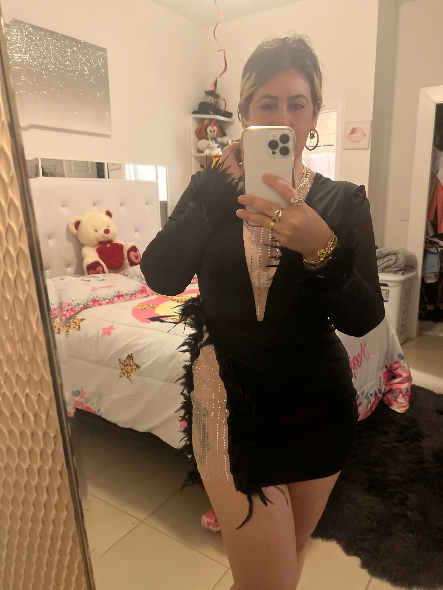 Articat-minivestido Sexy transparente con lentejuelas para mujer, Vestidos de malla de retales con escote en V profundo y plumas blancas para fiesta y club nocturno