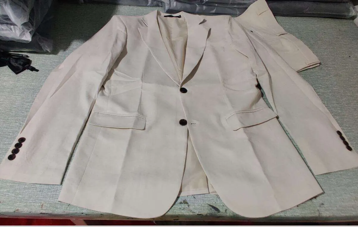 Beige lino de los hombres trajes de verano playa boda 2 piezas italiano abrigo conjunto chaqueta con pantalones de esmoquin de novio hombre de moda