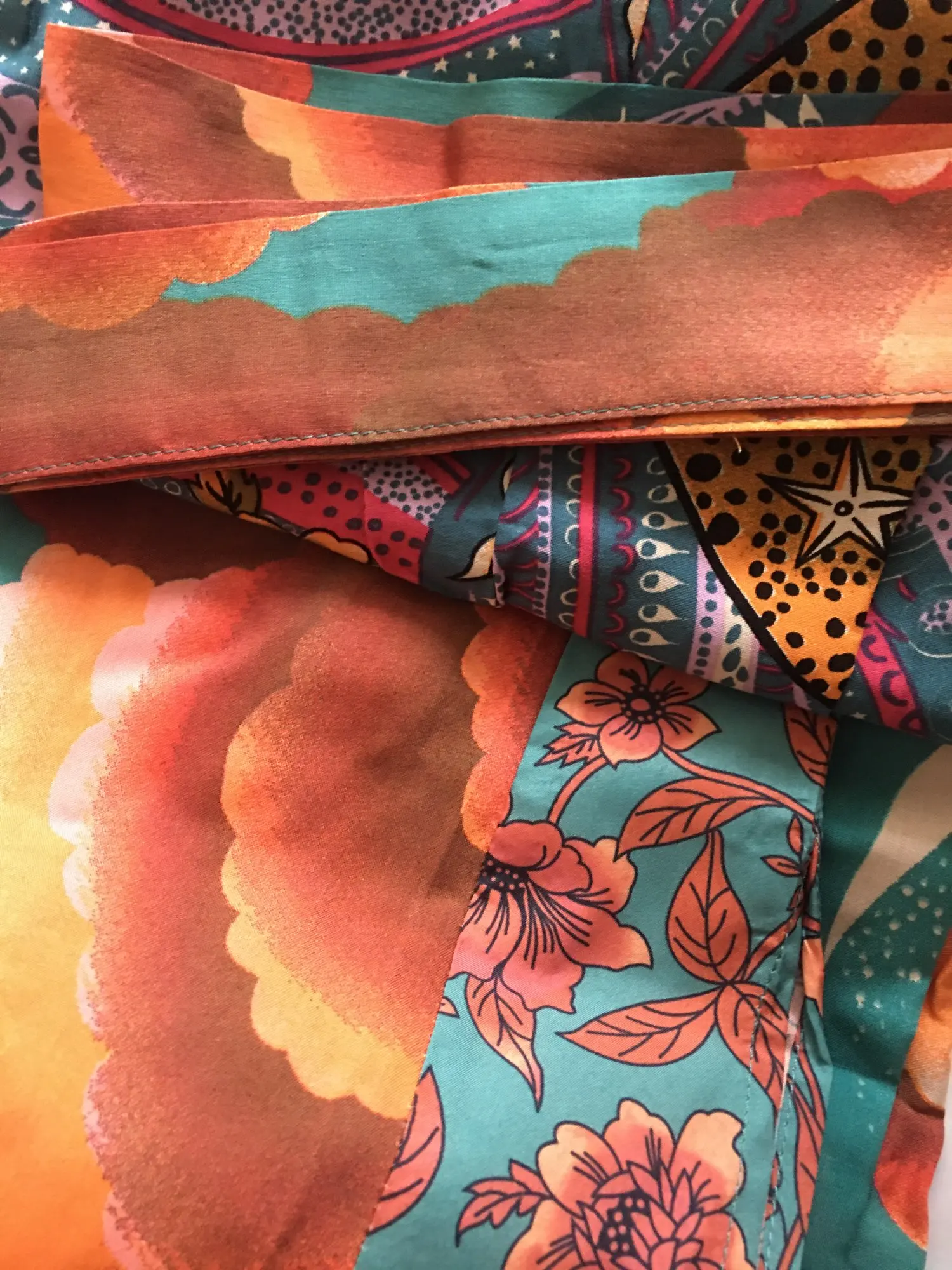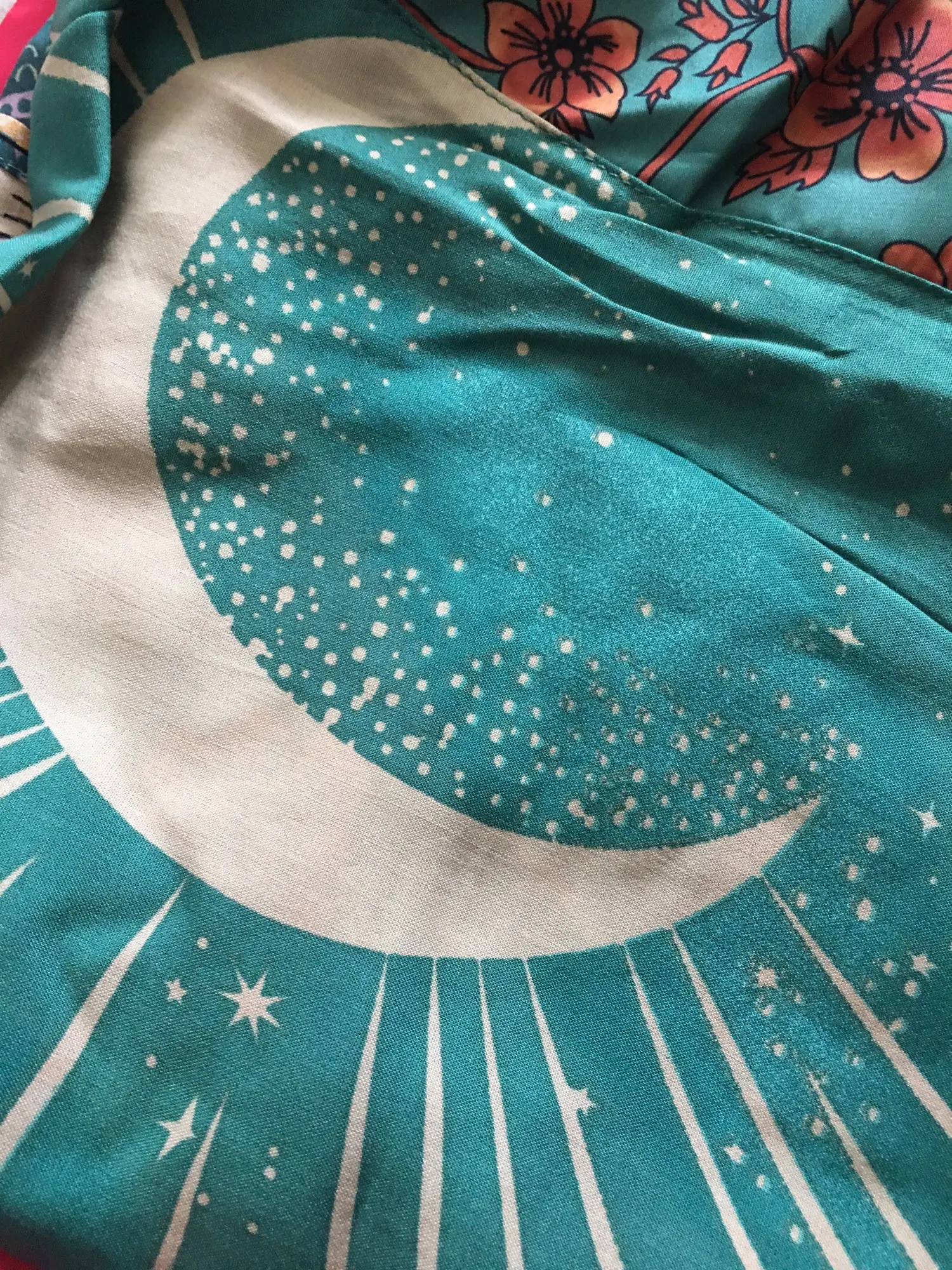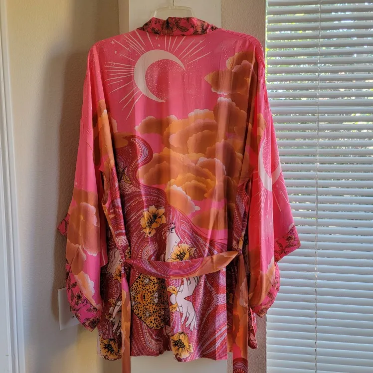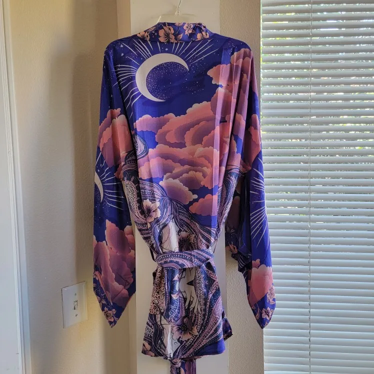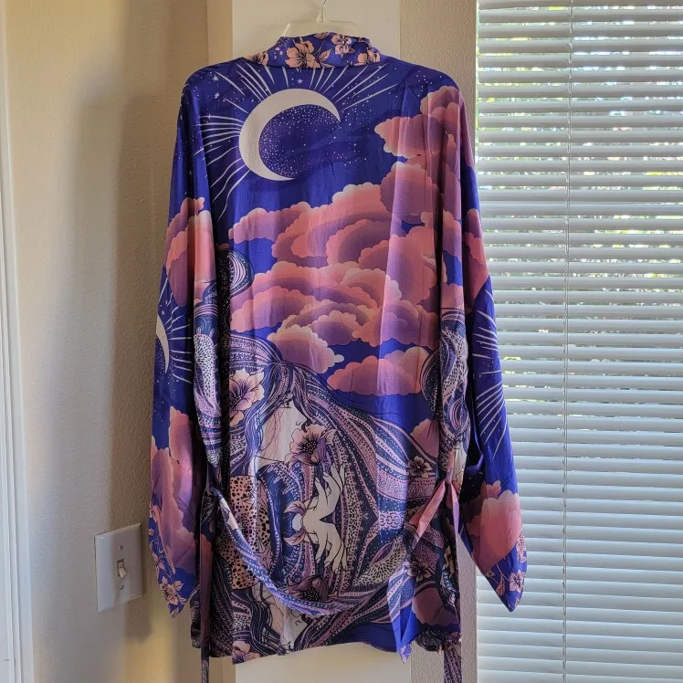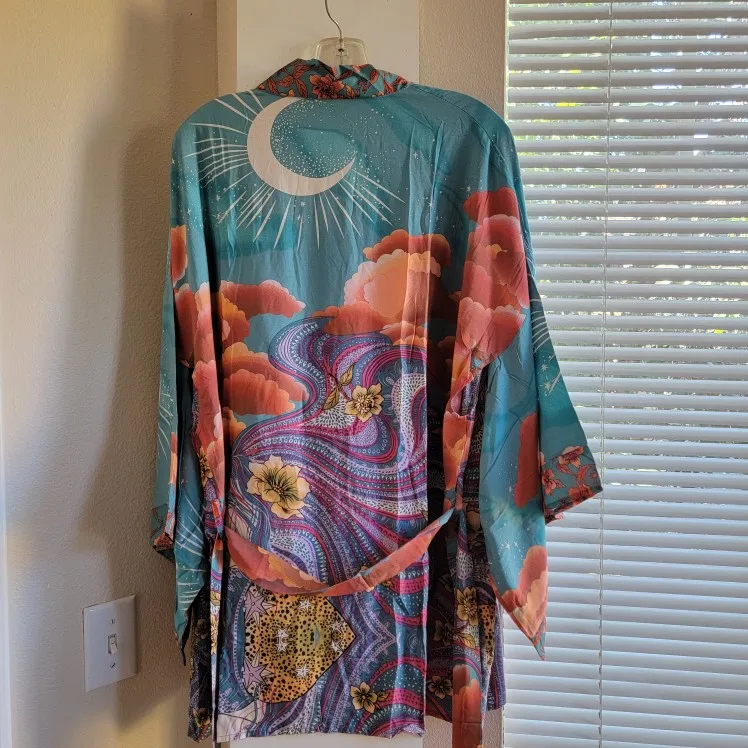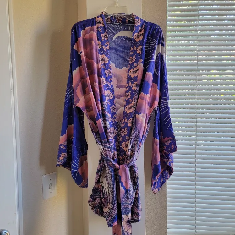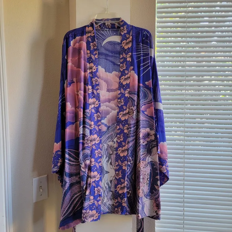 Blusa tipo Kimono con estampado de flores y Luna Azul para mujer, estilo bohemio Camisa larga, con lazo, para vacaciones y playa