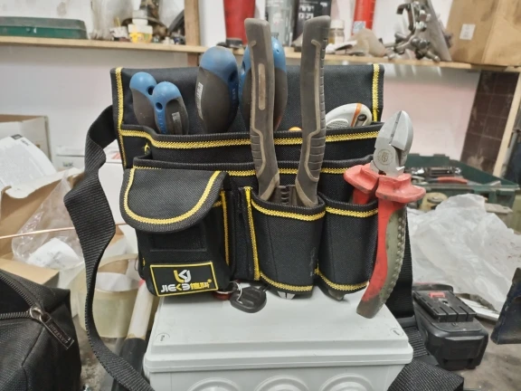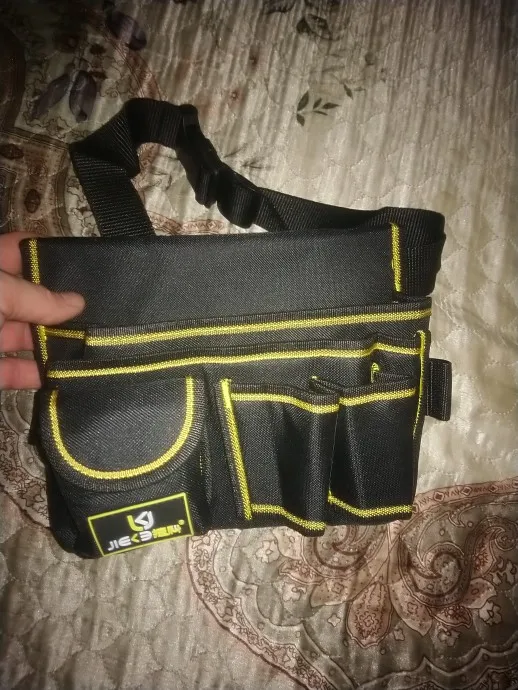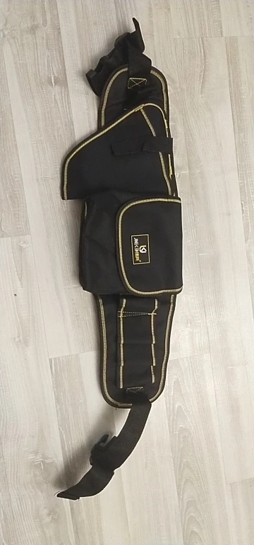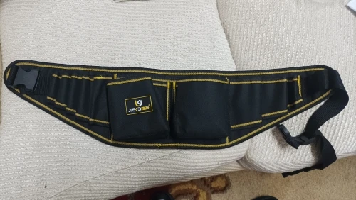 Tiene buena pinta, es bastante rígido, excepto la "correa de cinturón" que es una simple tira, lo cual tampoco me importa mientras cumpla su función. Los bucles para las herrientas en cambio tienen mayor grosor para que aguanten el roce constante. El bolsillo con tapa es semirigido. Las costuras vienen rematadas. De momento no le encuentro nada malo.
