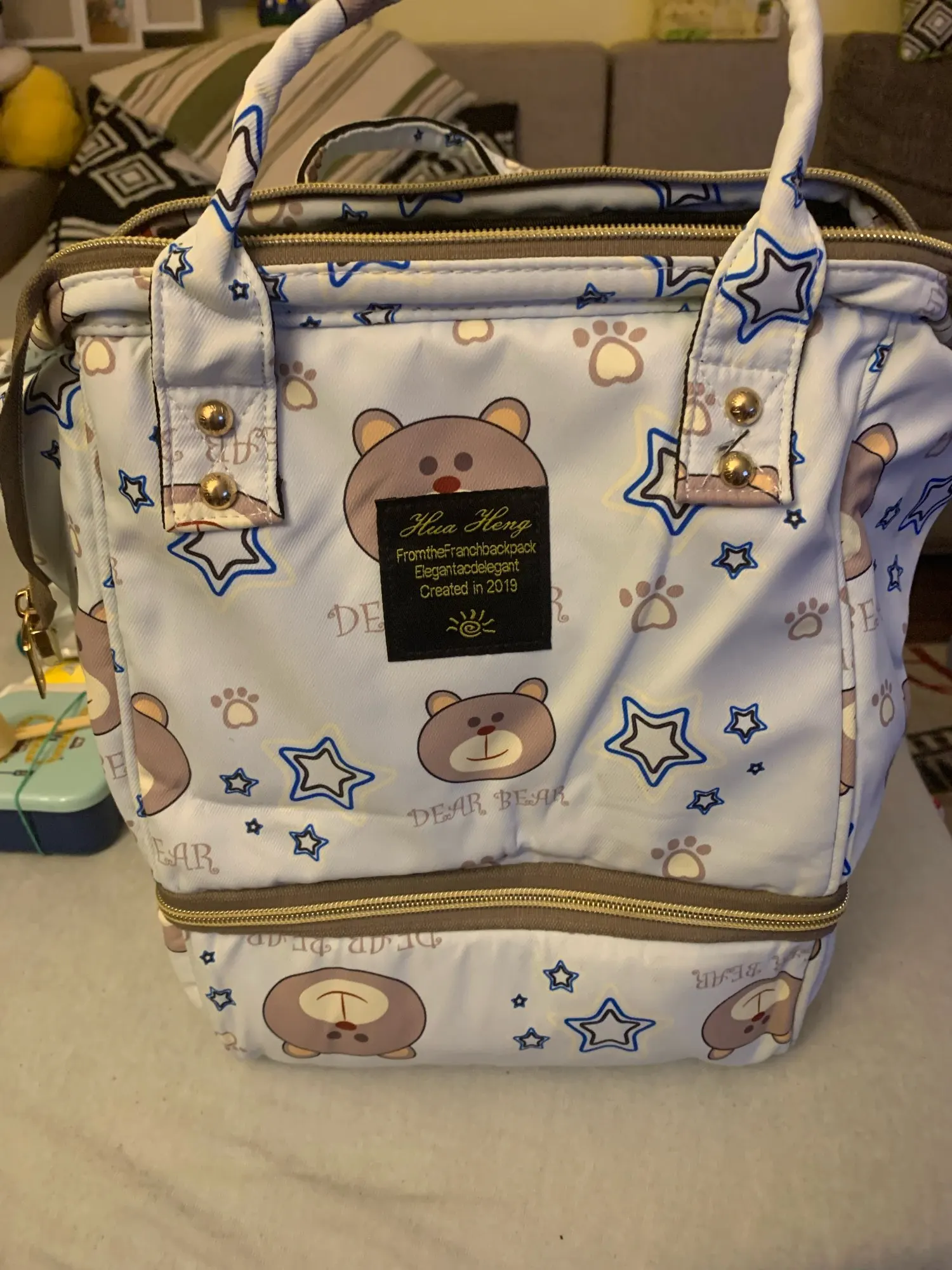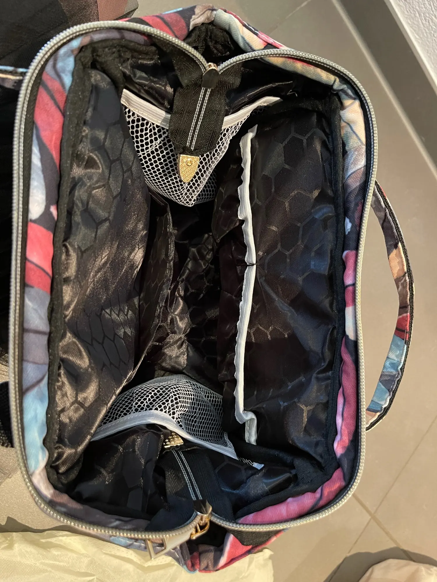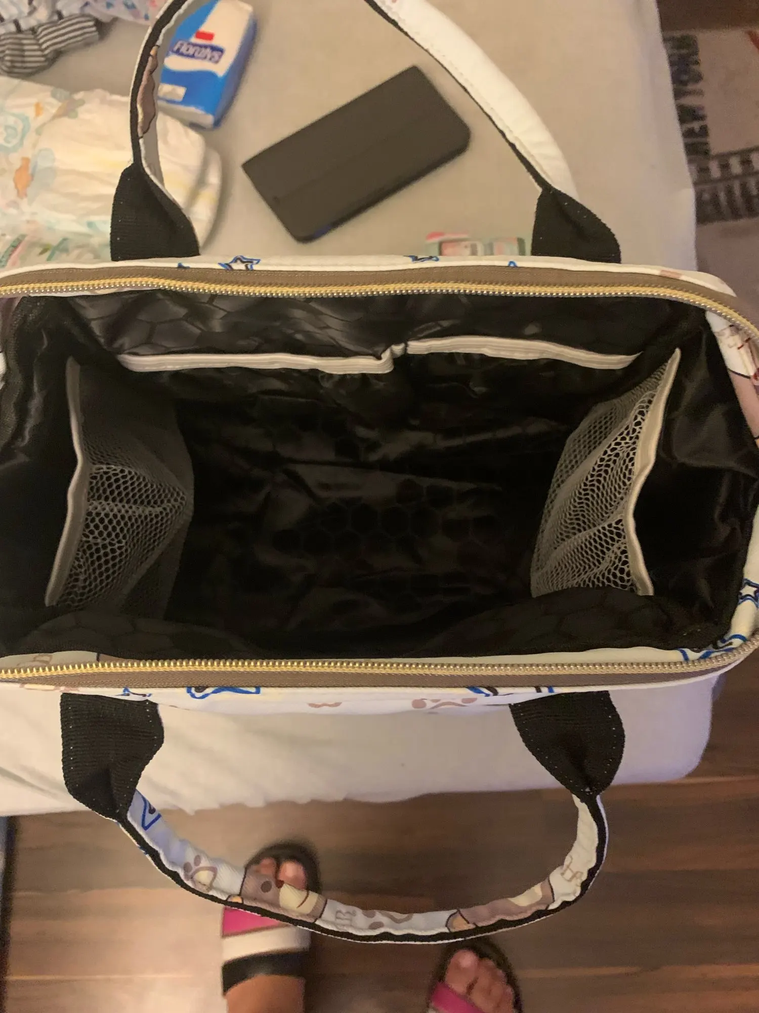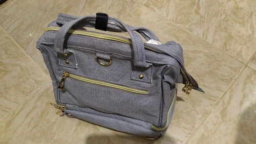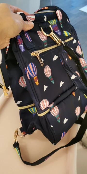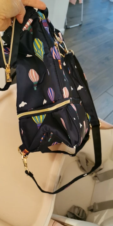 Me llegó está mañana. Al abrir el paquete;iba en una bolsa amarilla con asas de tela parece. Tacto suave,acolchado. Gran capacidad con bolsillos internos. Cremalleras color oro. Dentro tiene una cinta para ponértela de mochila. Me encantó,bonita y preciosa. Muy amplia y de gran capacidad