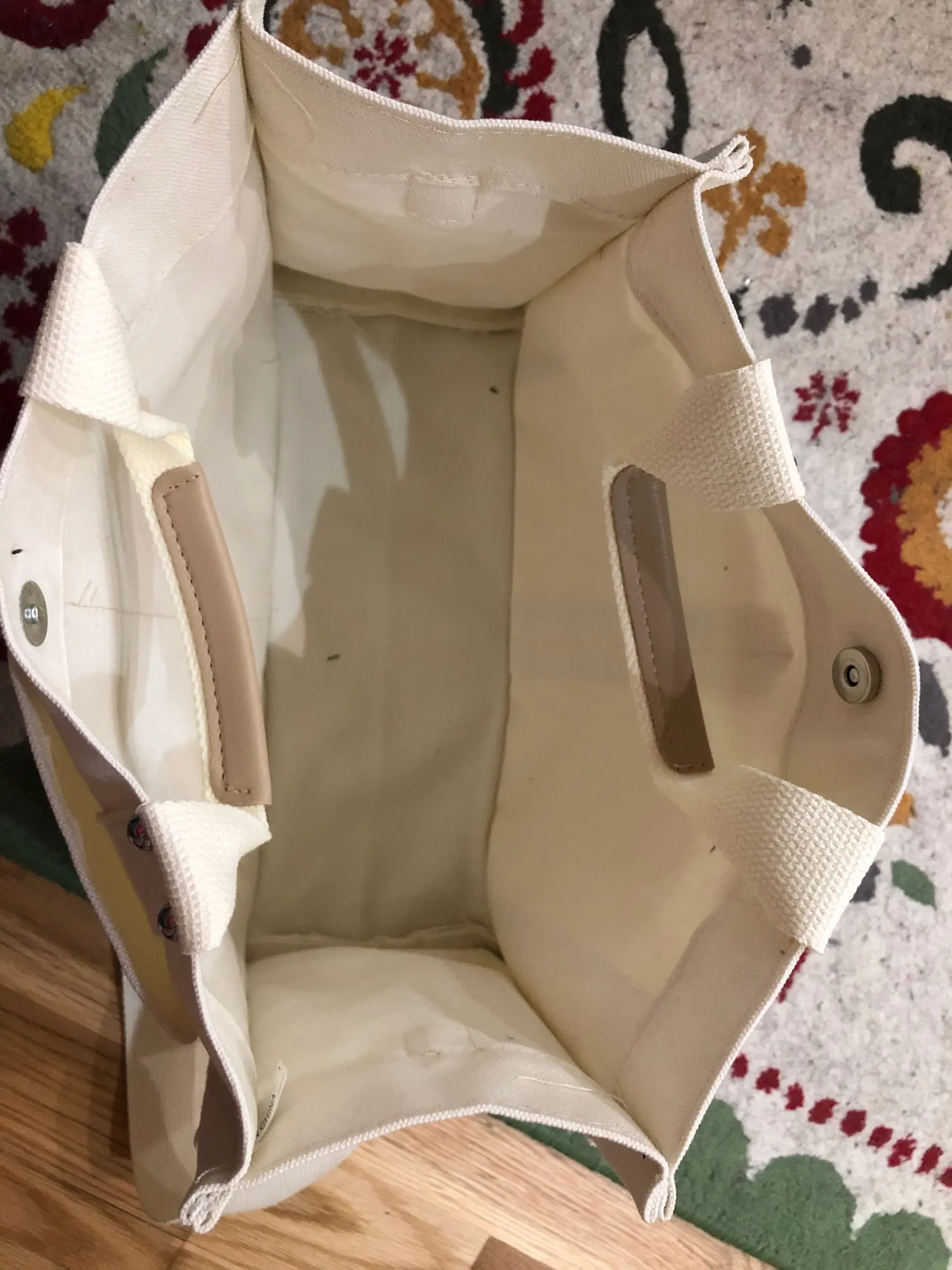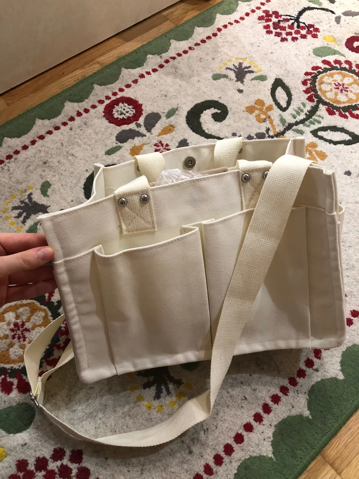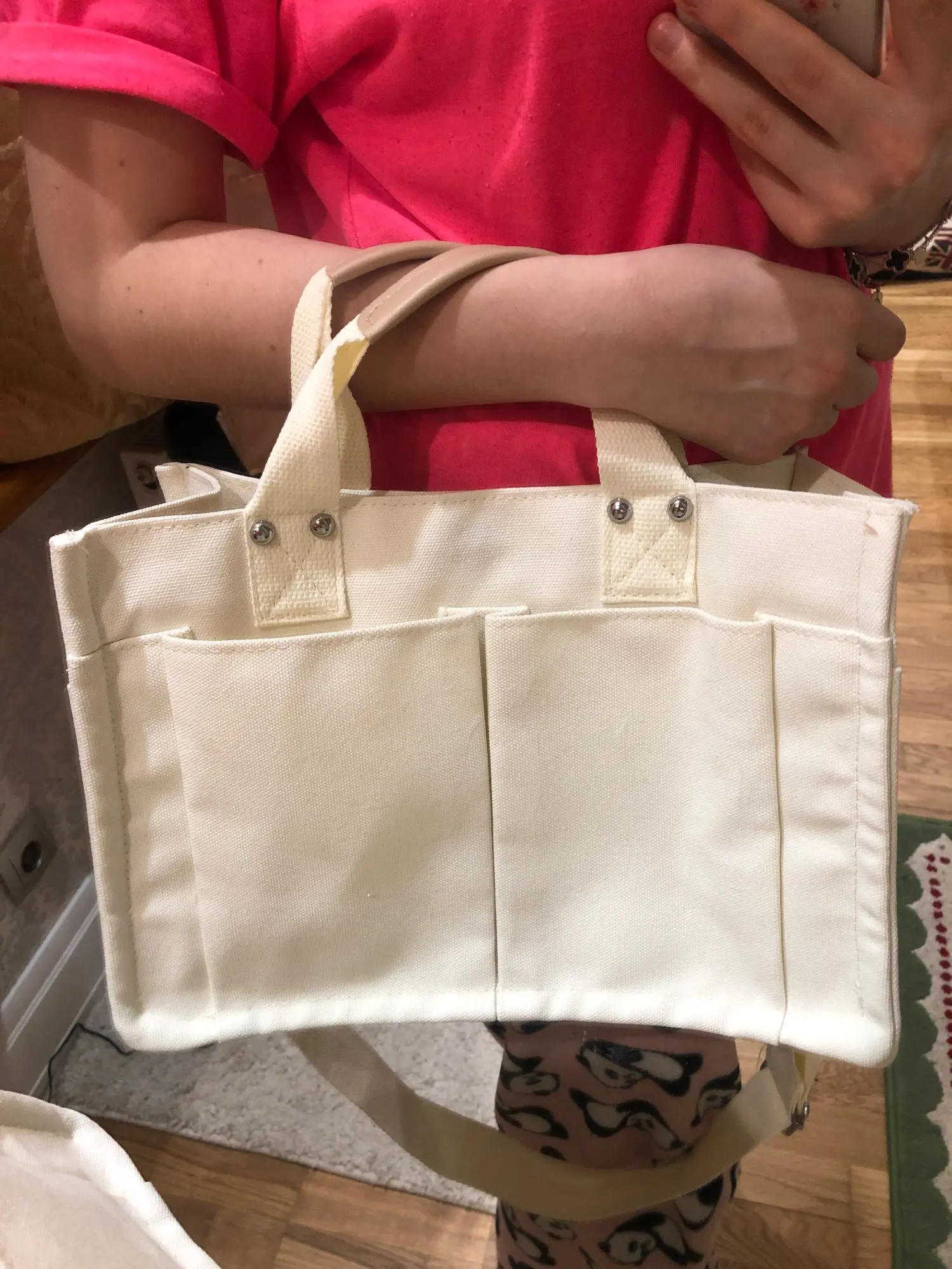 Me encanta, el material es resistente, el tamaño adecuado y las costuras firmes. Solamente un detalle que es el recubrimiento de las asas no está completo y se ve de mala calidad (el resto se ve bien, solo ese detalle). La correa duró menos de un día de uso y se rompió, la cambie por una con mejores broces