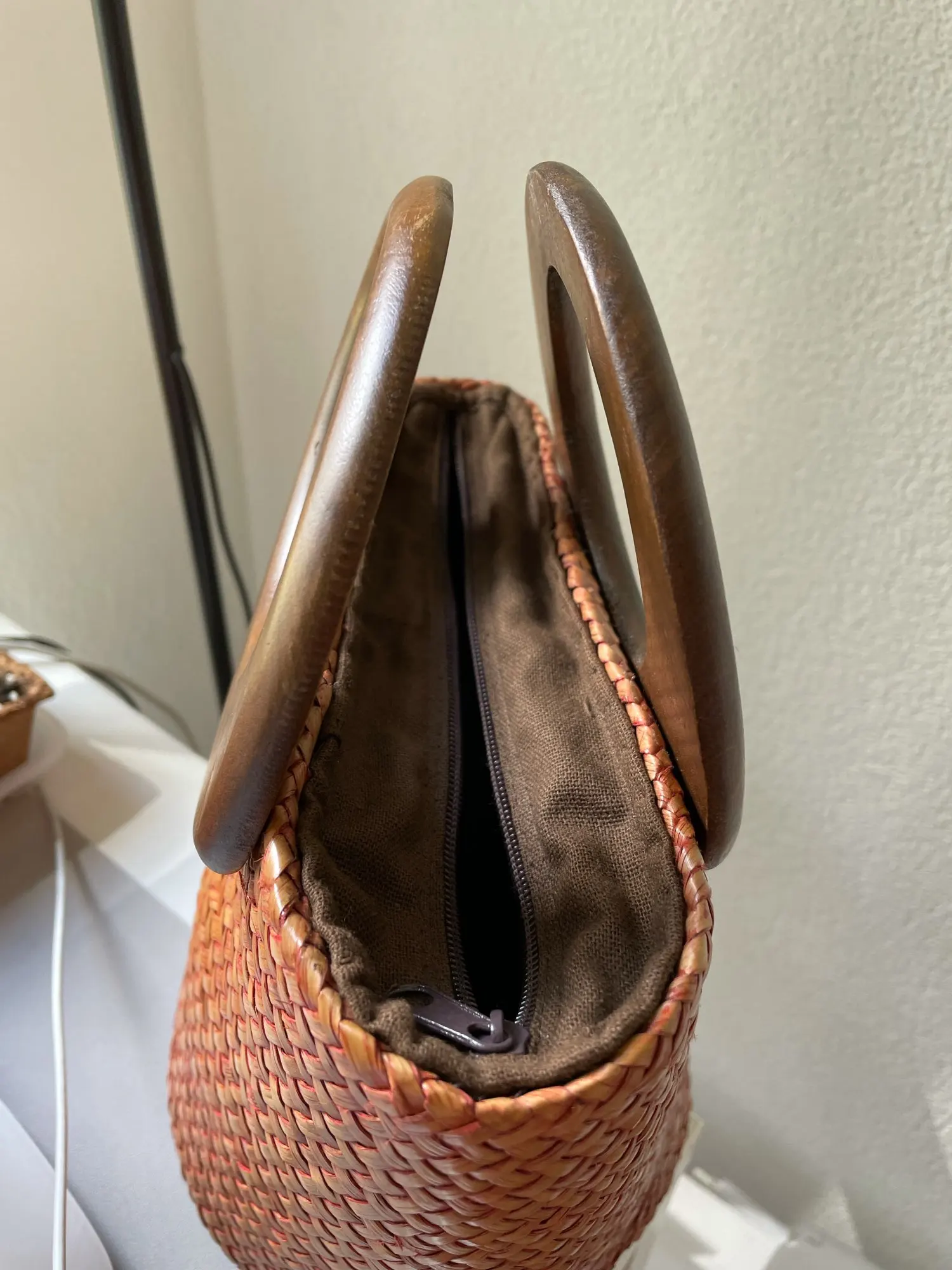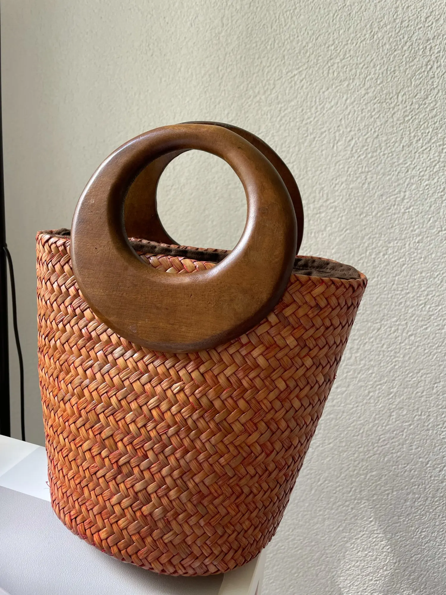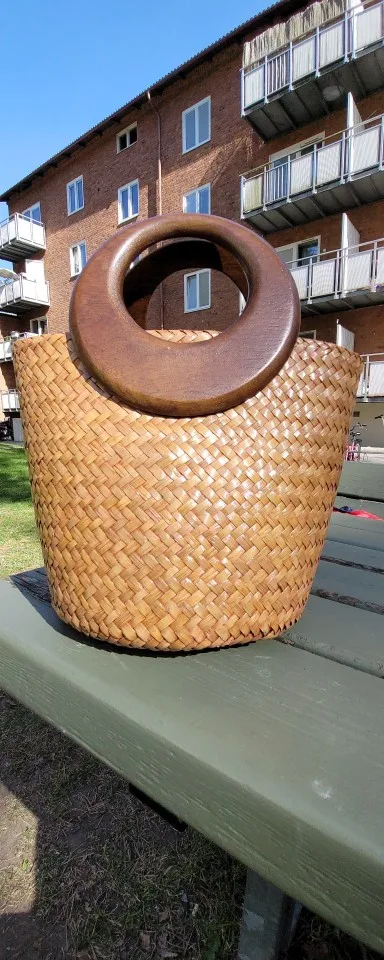 Bolso de paja hecho a mano con asa de madera, bolsos tejidos Vintage, para vacaciones en la playa, bolso de cubo de ratán