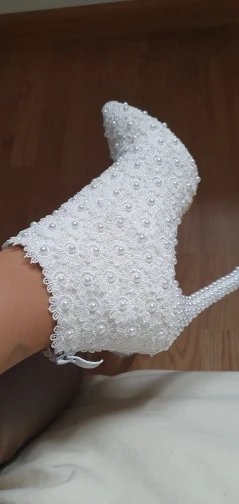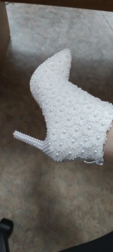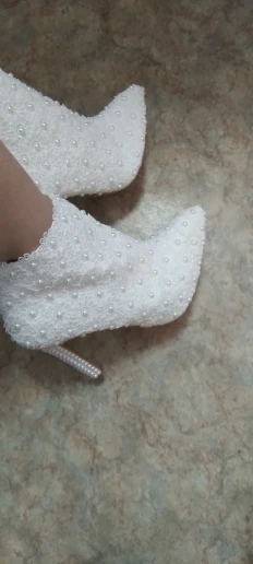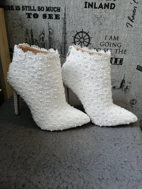 Botas de cuero de tacón alto para mujer, botines puntiagudos de encaje de perlas, zapatos de boda, botas cortas blancas de tacón de perla para primavera y otoño