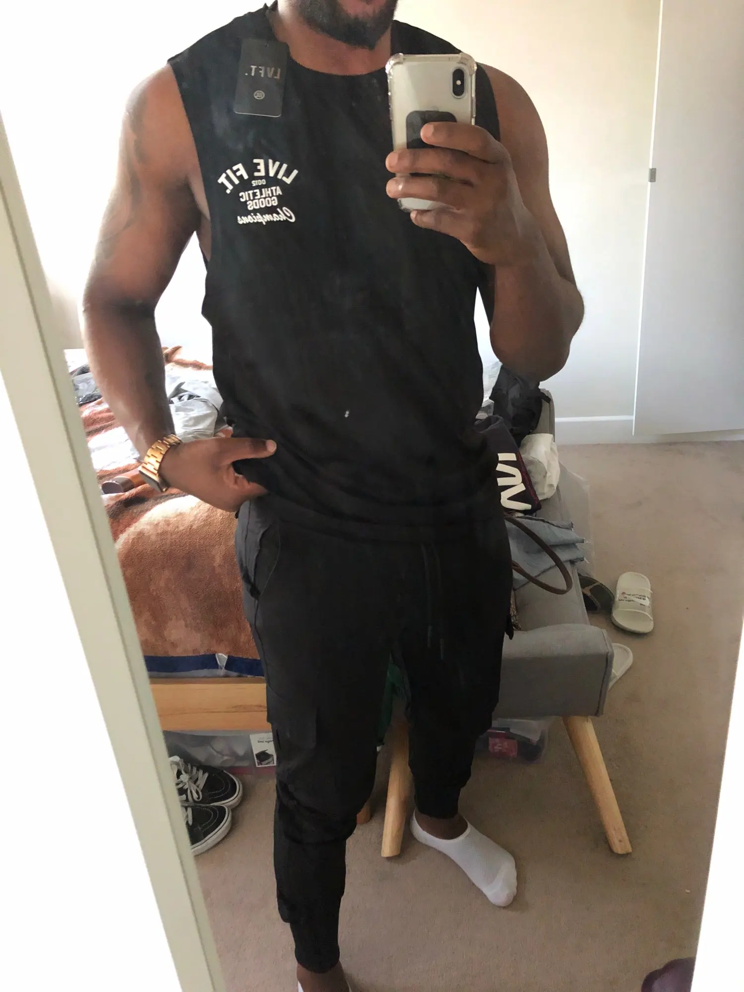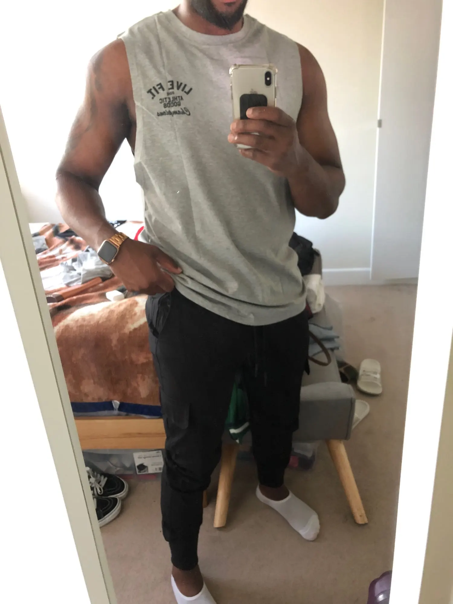La camiseta está guapísima, y siempre hay q medirse el torso . yo gasto la M y pedí la XL y me queda perfecta, lo único que lleva un defecto que va cosida en la así la una más larga que la otra , pero para hacer deporte me vale. envio súper rápido a España 8 días.