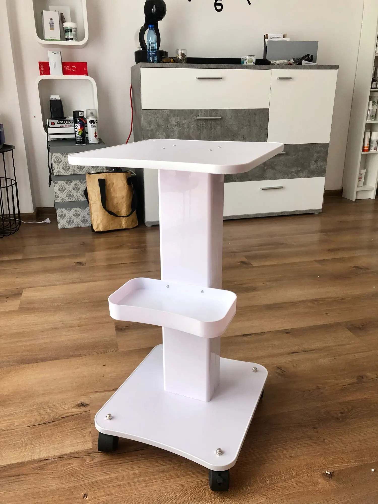 Carro de salón de belleza ABS para uso en salón, rodante de Pedestal, rueda de aluminio, soporte, aparato de cuidado Personal