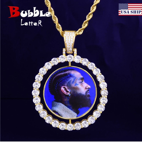 Colgante de doble cara con foto giratoria para hombre, collar con medallones de 4mm, cadena de tenis de circón, joyería de Hip Hop de 2x1,65 pulgadas