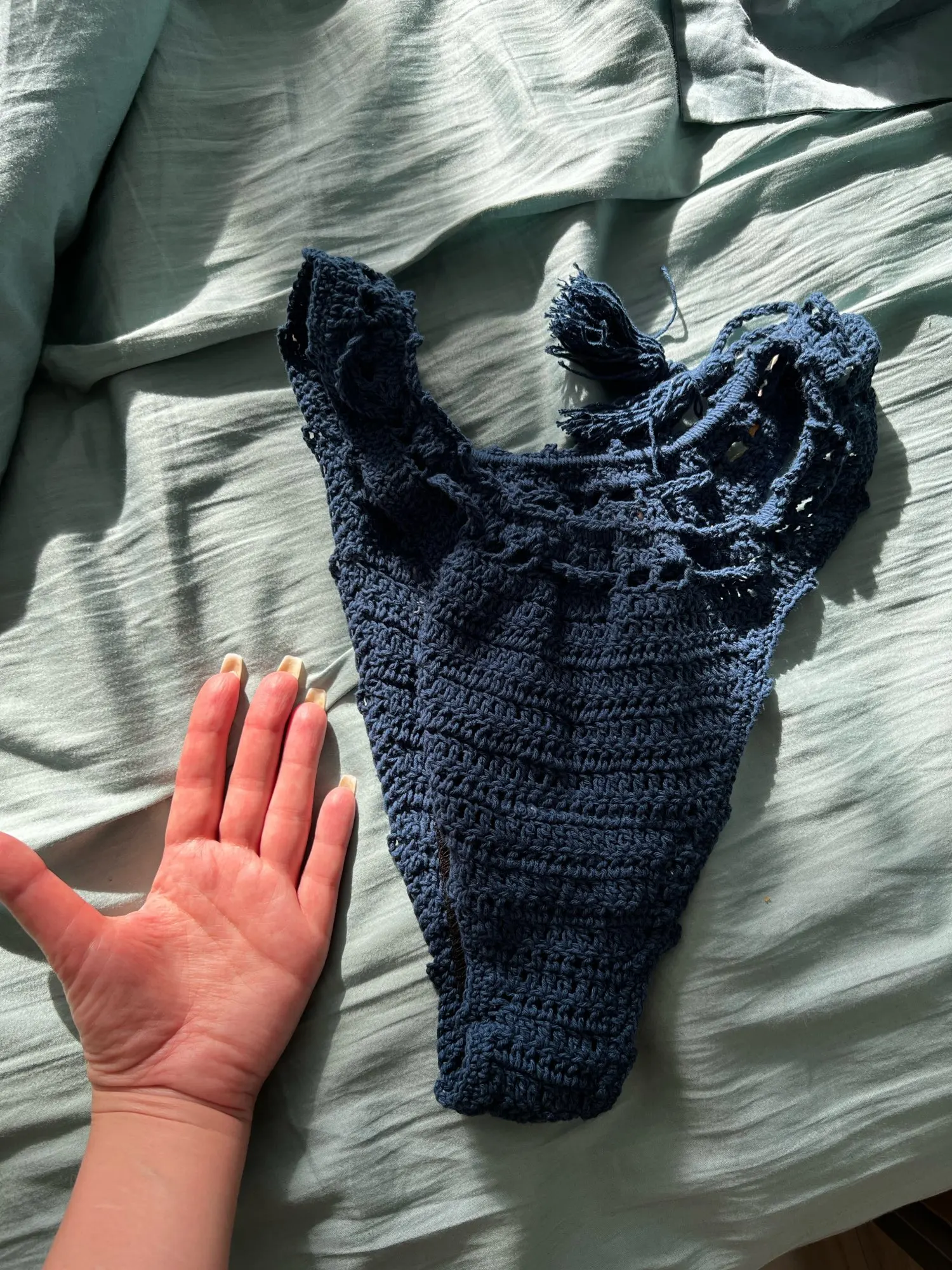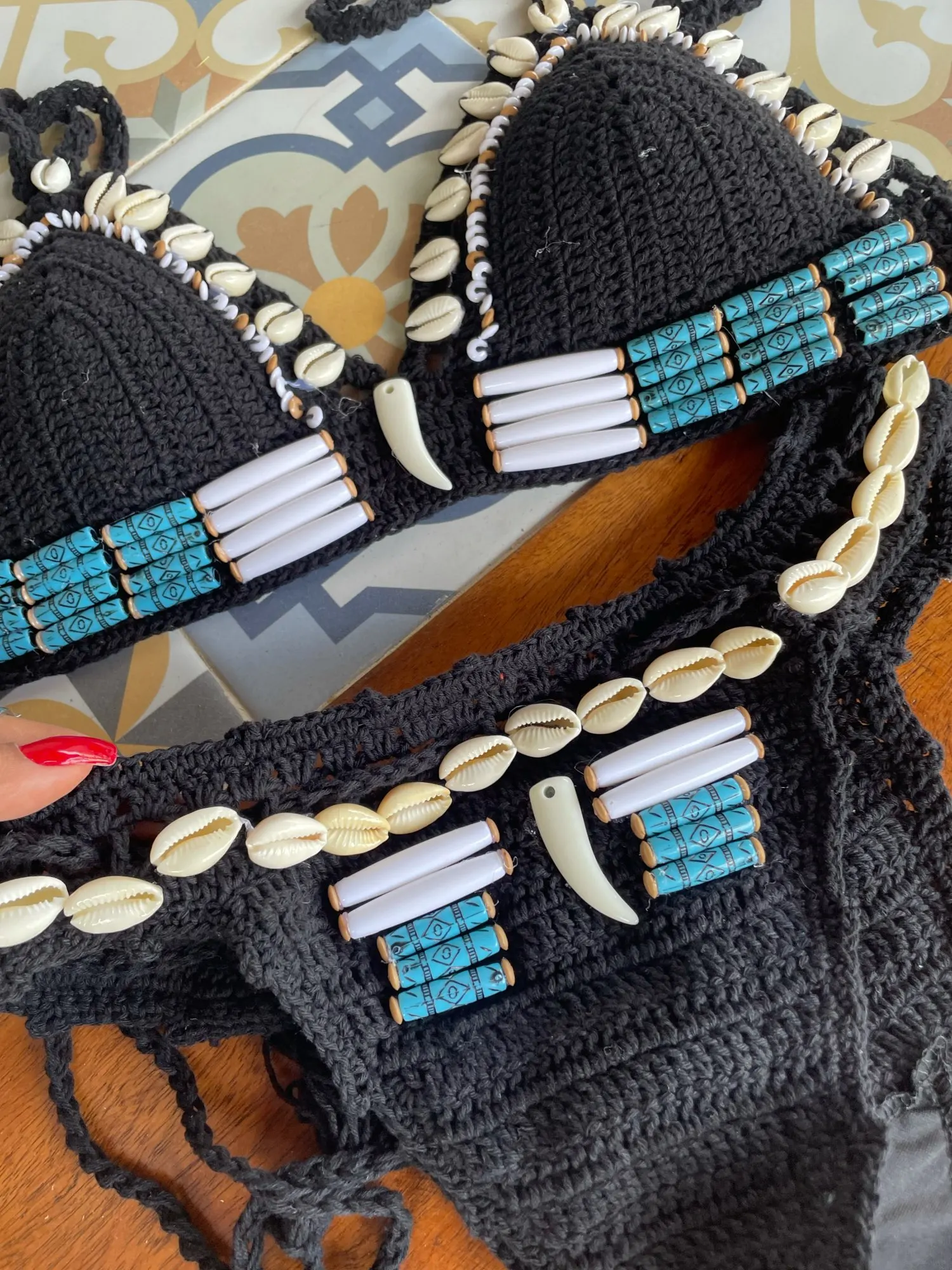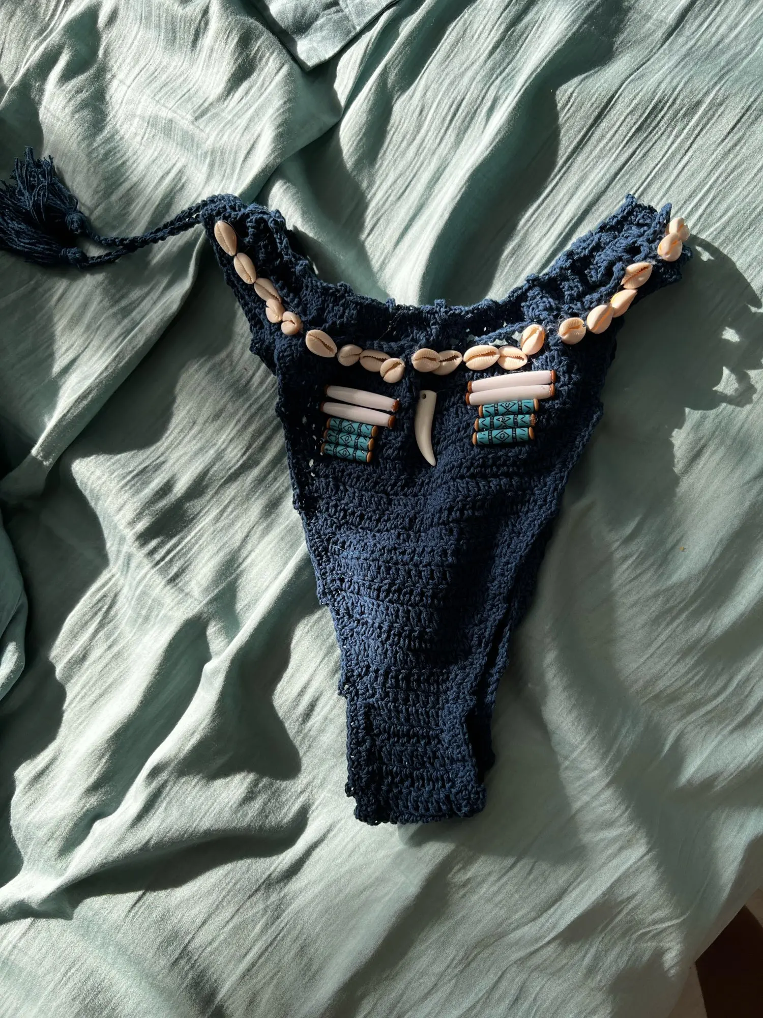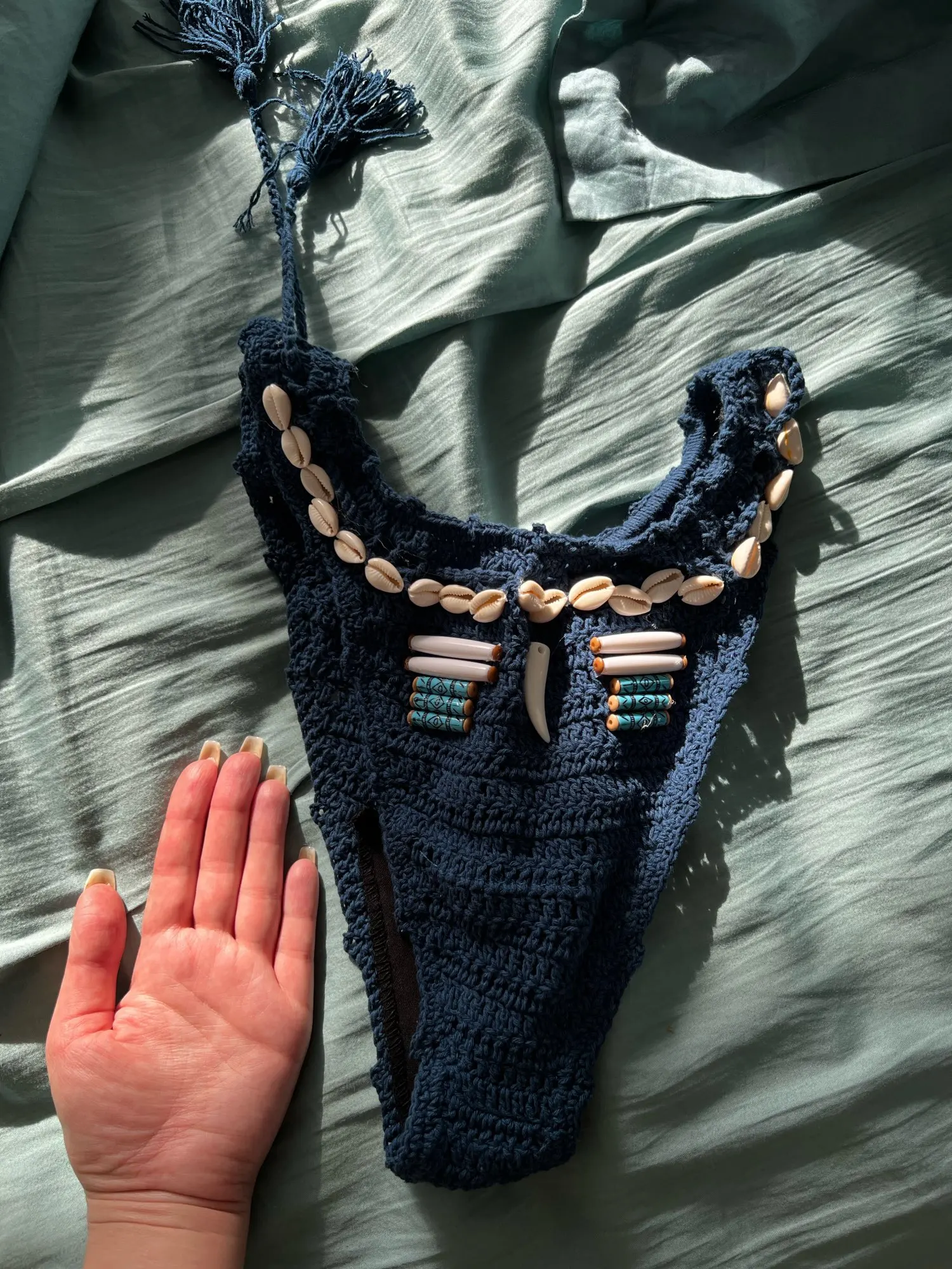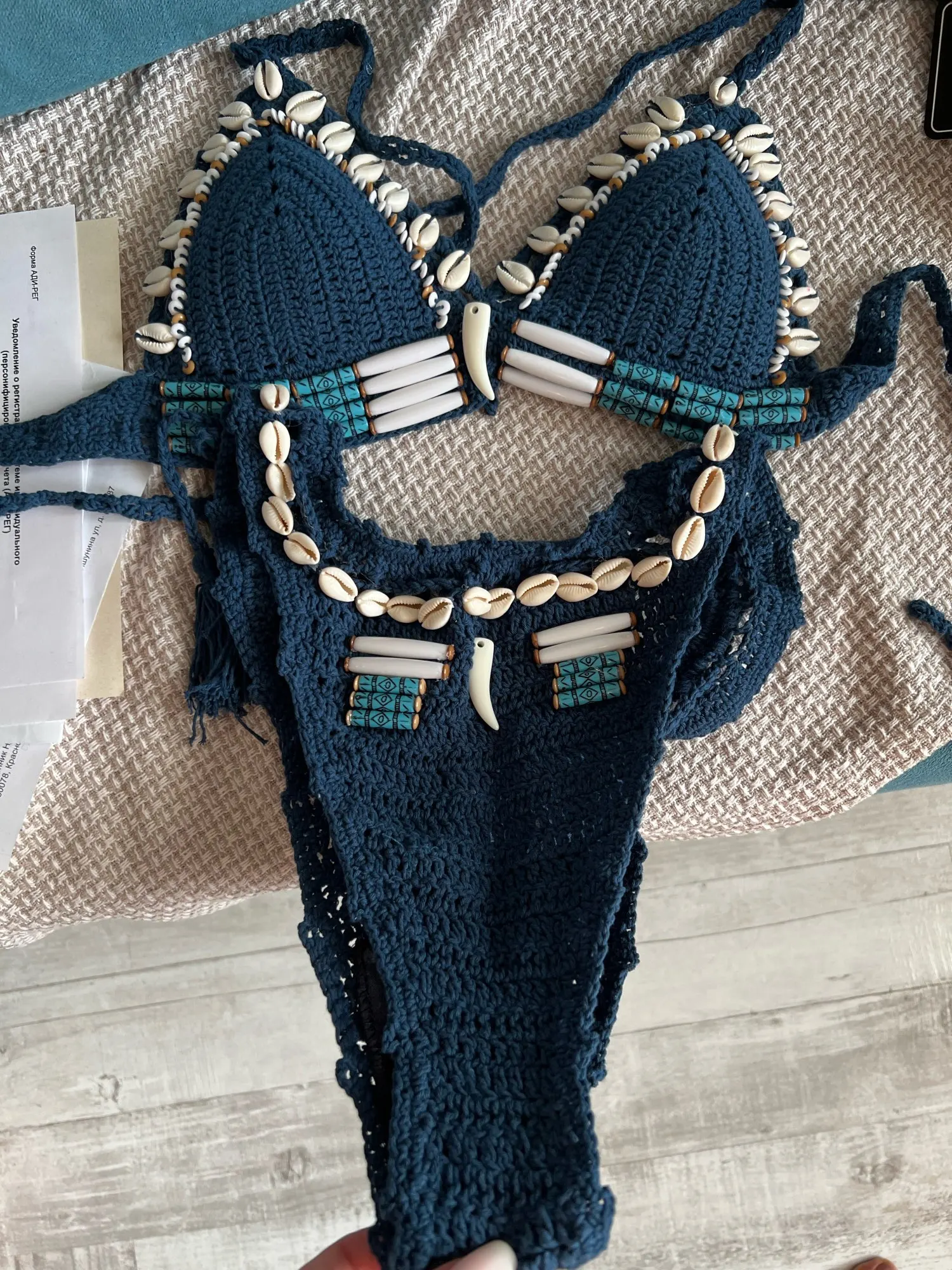 Conjunto de Bikinis con cuentas de concha azul para mujer, bañador Sexy hecho a mano de ganchillo, traje de baño de alta calidad con Push-Up, ropa de baño de punto para playa