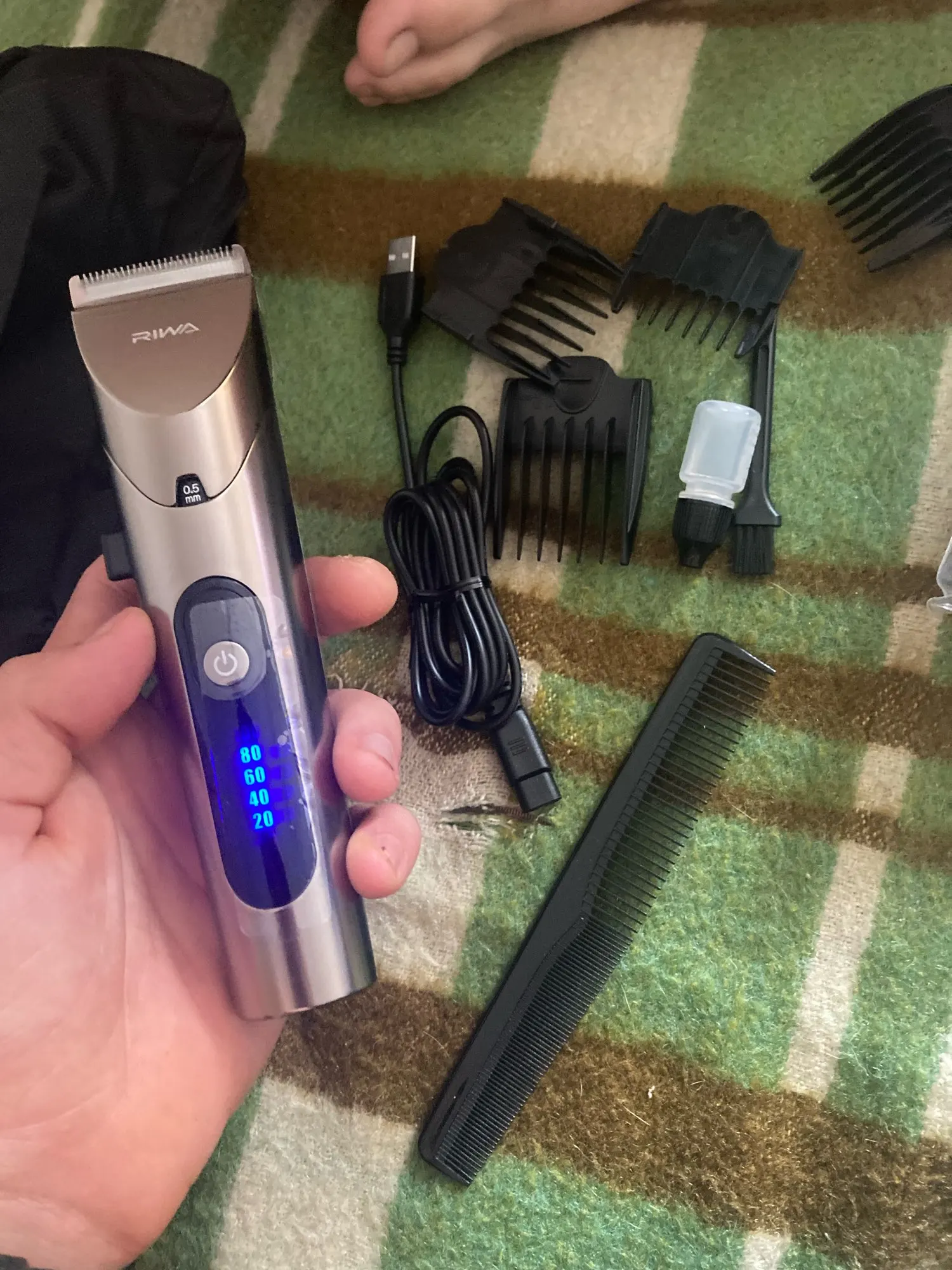 Vino sin caja del producto pero dentro de un papel de burbujas. Un neceser con los todos los accesorios dentro y la maquinilla dentro en una caja sin rotular. Al tacto se siente bien y robusta, los accesorios de plástico más endebles. Falta probarla.