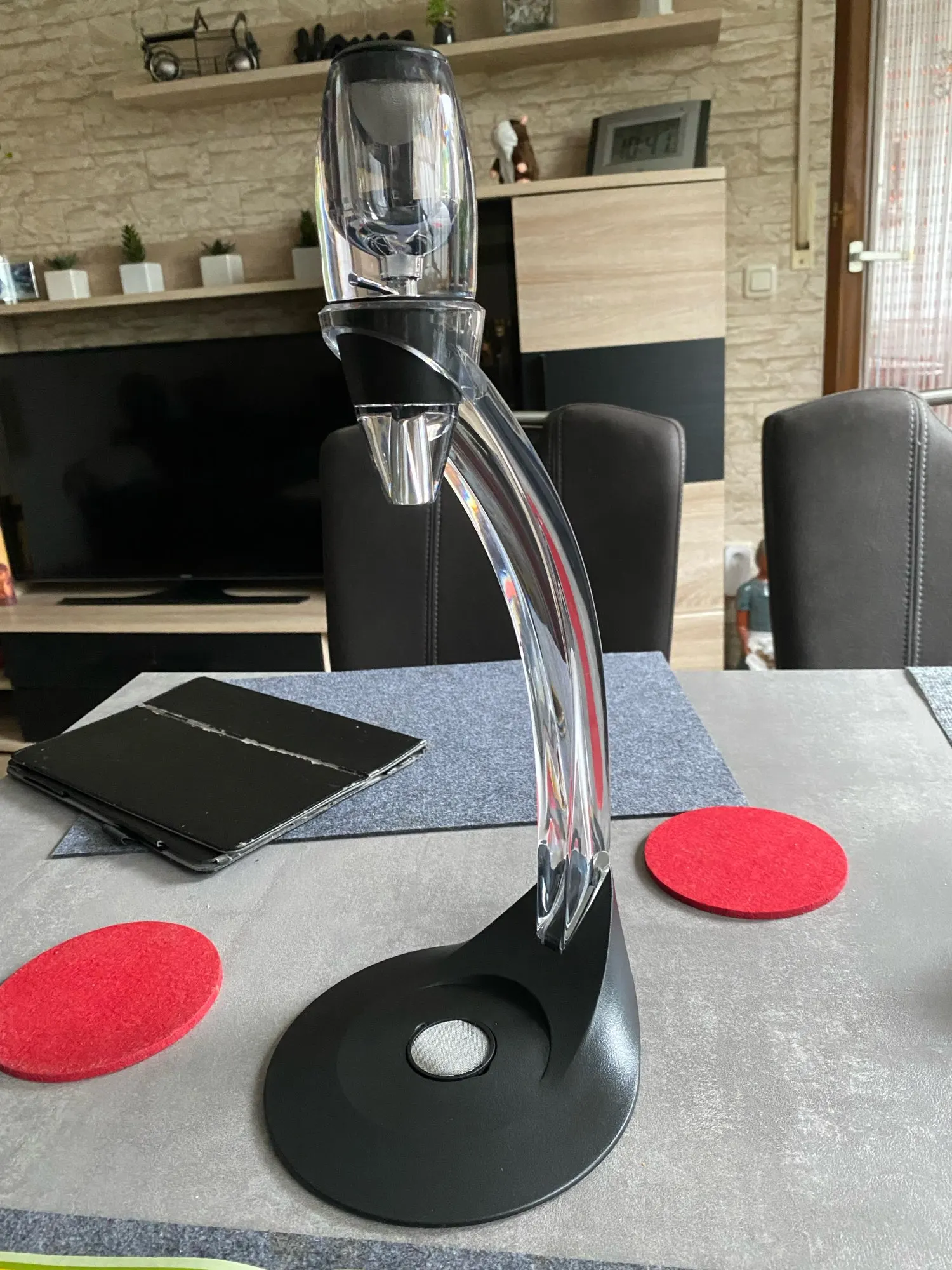 Envío rápido. Esta es una cosa que no te planteas como necesaria, pero una vez que la tienes la usas. Un decantador chulo y práctico, sobre todo con la peana, pones la copa debajo y listo. Es bonito, práctico y a muy buen precio, si te gusta el vino, es una opción muy bonita de regalo. Yo personalmente estoy contento.