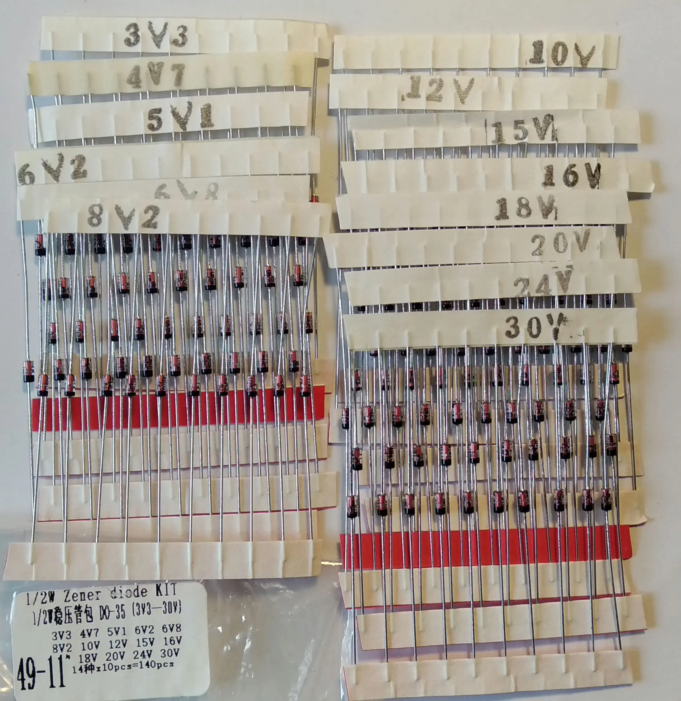 Diodo Zener de 1/2w, 0,5 W, 3,3-30V, 14 Valores * 10 Uds = 140 uds, juego surtido de nuevos kit diy electrónico