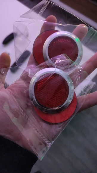 Reflectantes de tamaño correcto y material plástico normal, el adhesivo ha pegado perfectamente y ya estan colocados en la moto. En principio buen producto. Nada que objetar, quedan muy bonitos