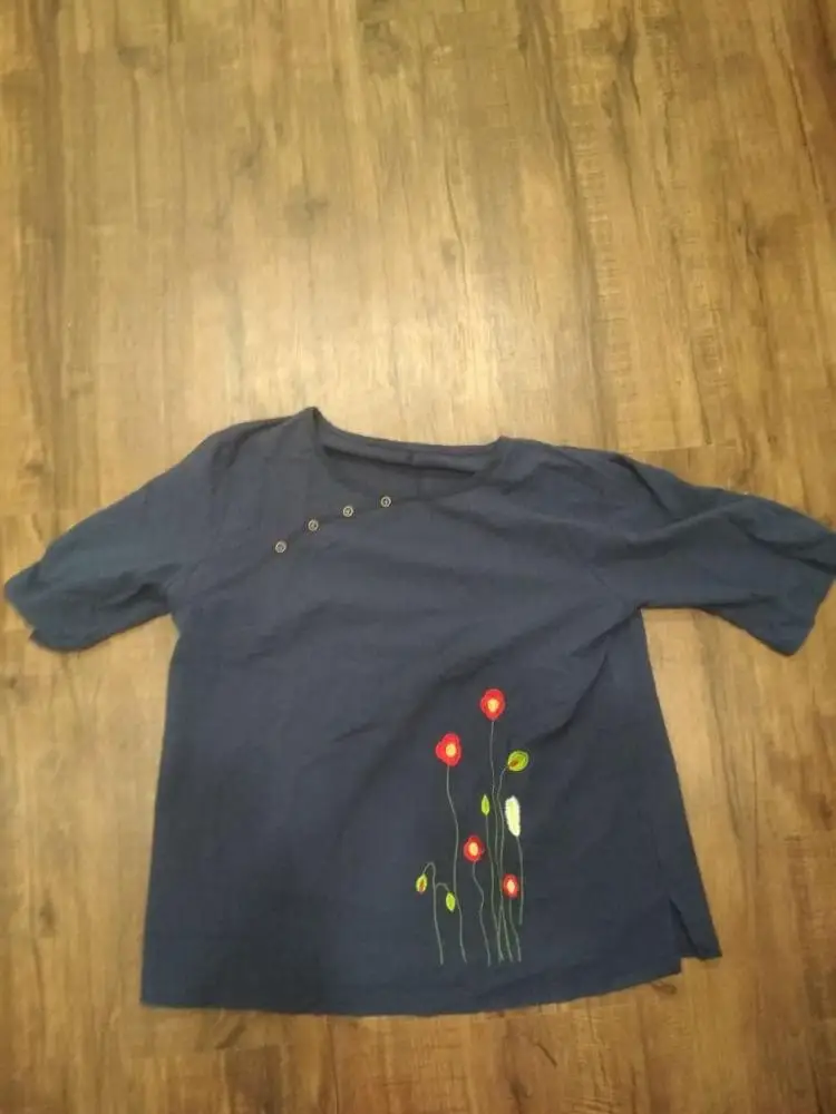 Estilo chino Blusa de manga larga de las mujeres de cuello en O bordado Floral Vintage camisa blusa Top Mujer