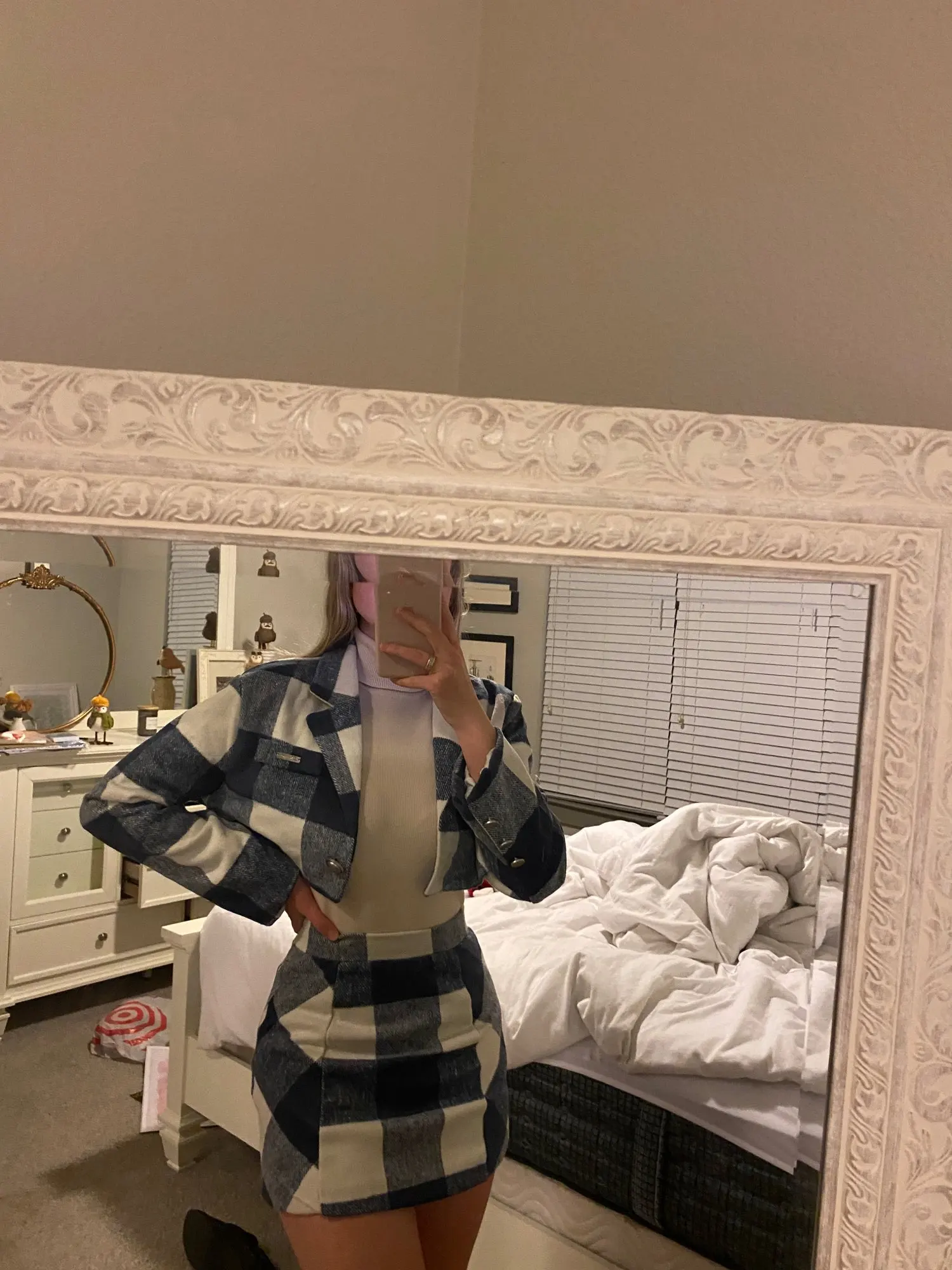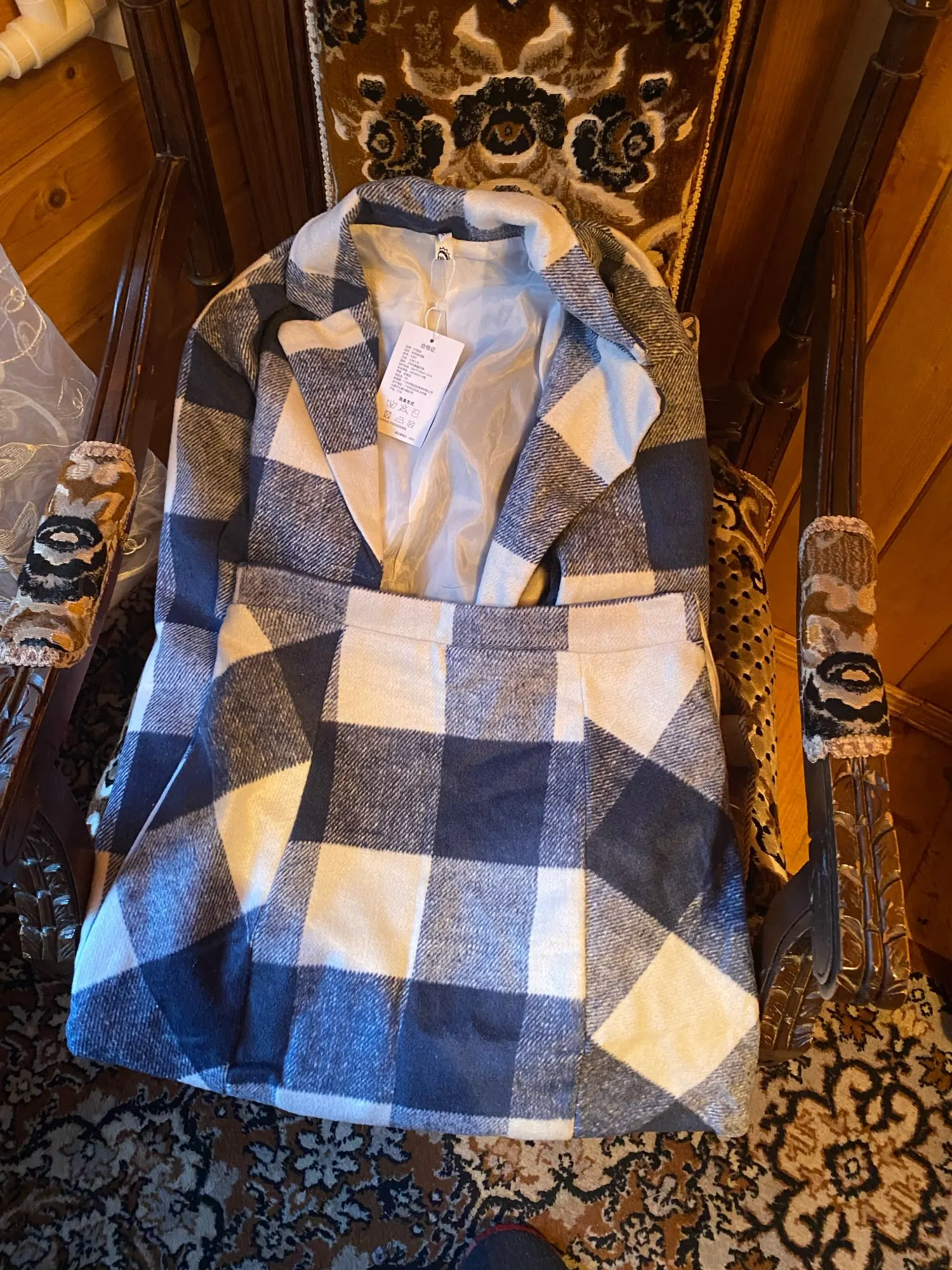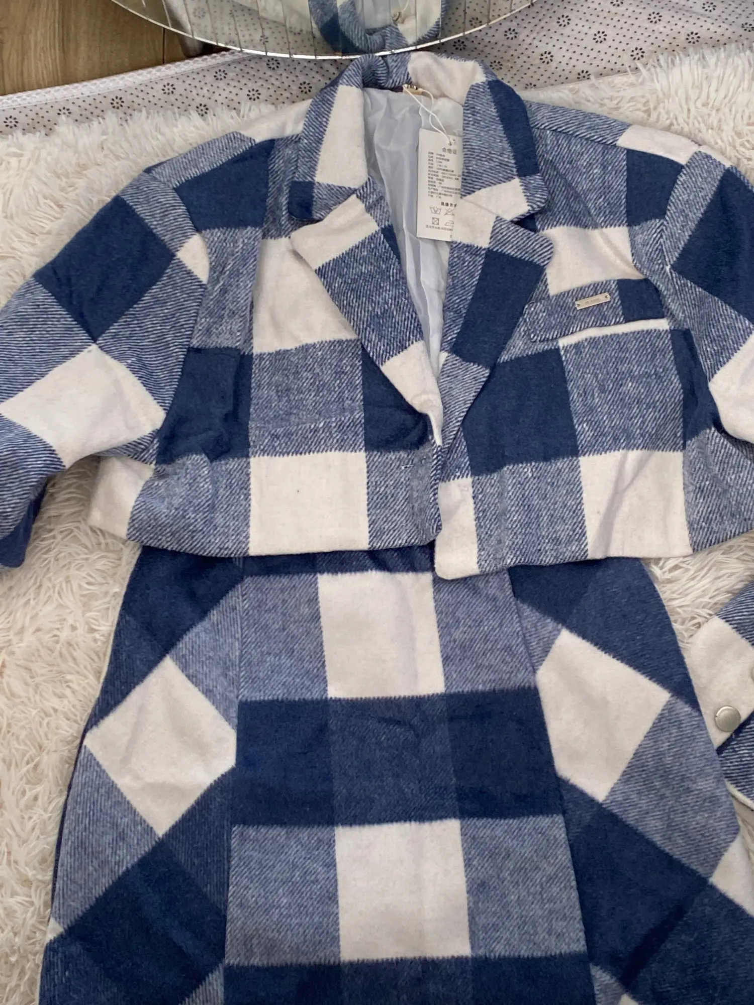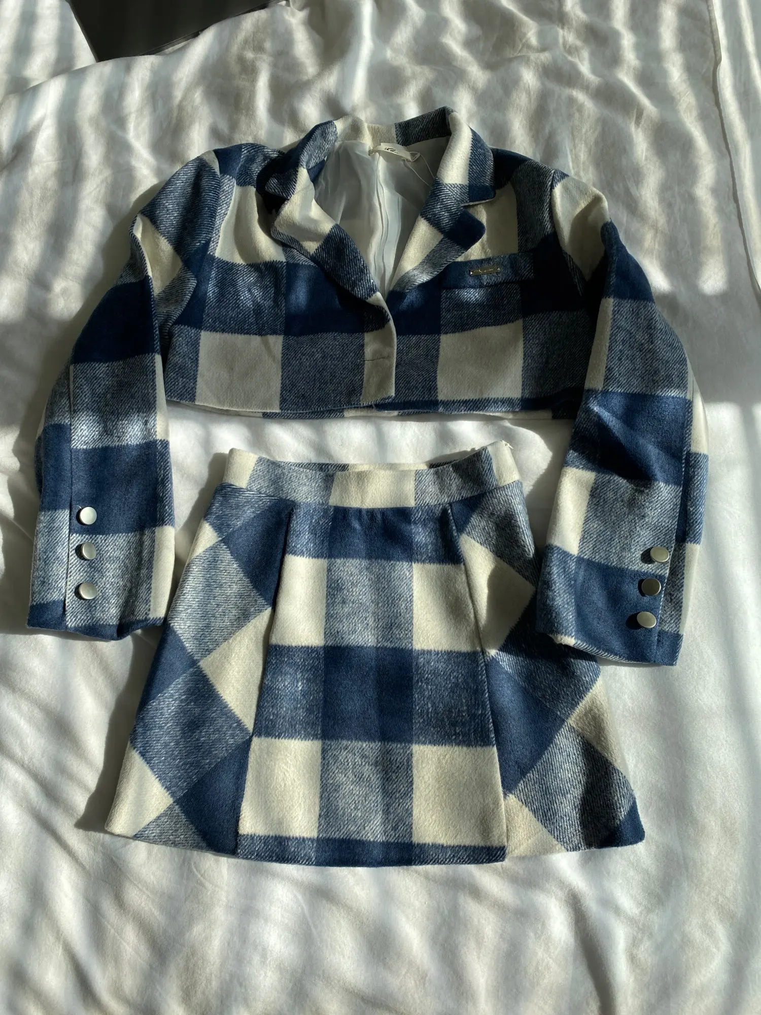 Envío recibido con gran rapidez. Talla L que parece una M. Para unos 57kg/69 cintura se necesita esta talla. La falda tal Vez no esté bien rematada en el bajo peto la chaqueta es impresionante. Agradecida por el presente y la rapidez