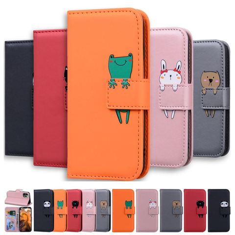 Funda de cuero con tapa para teléfono móvil, funda de soporte de cartera para iPhone 12, 11 Pro, XR, XS, Max, 5, 6S, 7, 8 Plus, gato, Rana, conejo