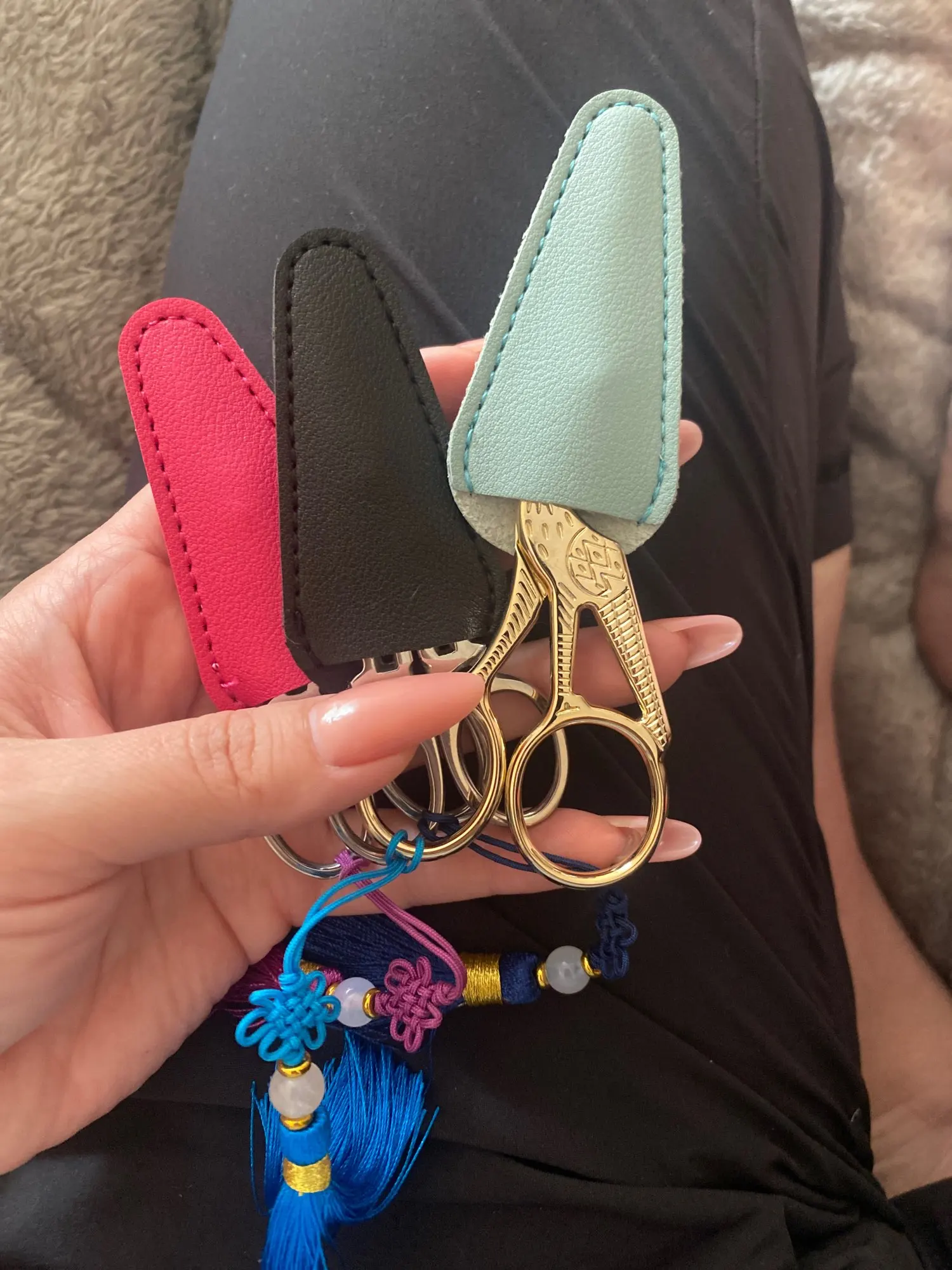 Van bien con todas las tijeras de bordado, son ligeramente más anchas que las otras Y menos alargadas , muy bonitas Y se ajustan bien a las tijeras