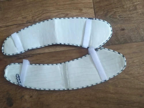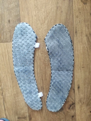 Es tal y como se muestra en las fotos de anuncio. El material es fieltro, pero NO es nada grueso. A mi me da igual porque lo que buscaba era no helarme las piernas.