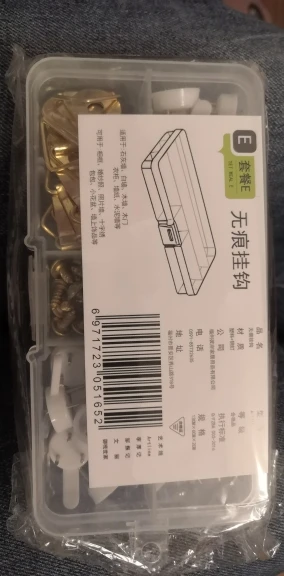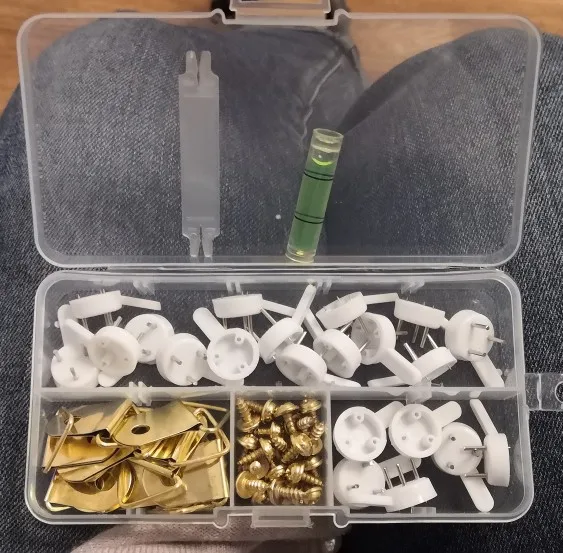 Caja bastante completa con variedad de enganches para colgar objetos poco pesados o cuadros.