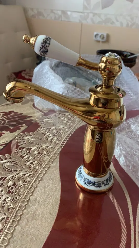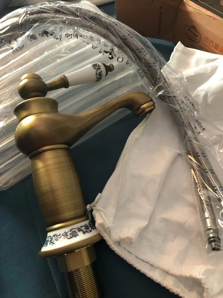 Grifo de baño bronce antiguo cobre caliente y cubierta fría montada, grifo de lavabo decoración de cerámica Latón dorado acabado