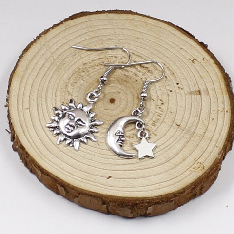 Hecho a mano desajuste sol Luna y estrellas pendientes CELESTIAL tibetana regalo de plata, Wicca pagano pendientes de luna creciente