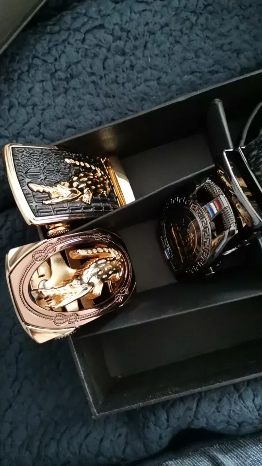 Hi-Tie-cinturones con hebilla automática de cuero genuino para hombre, conjunto con caja de regalo, cinturón de diseño de lujo informal de cocodrilo dorado