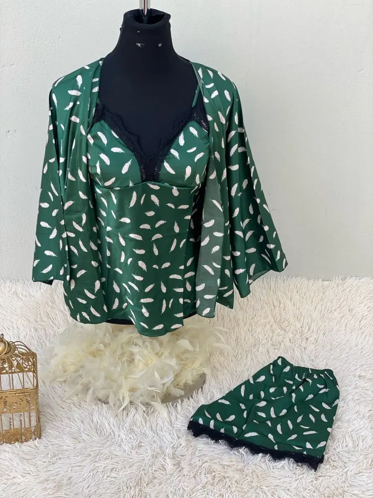Hielo con Pad camisón camisola pantalones cortos traje de 3 piezas conjunto de mujer de encaje Sexy Pijamas