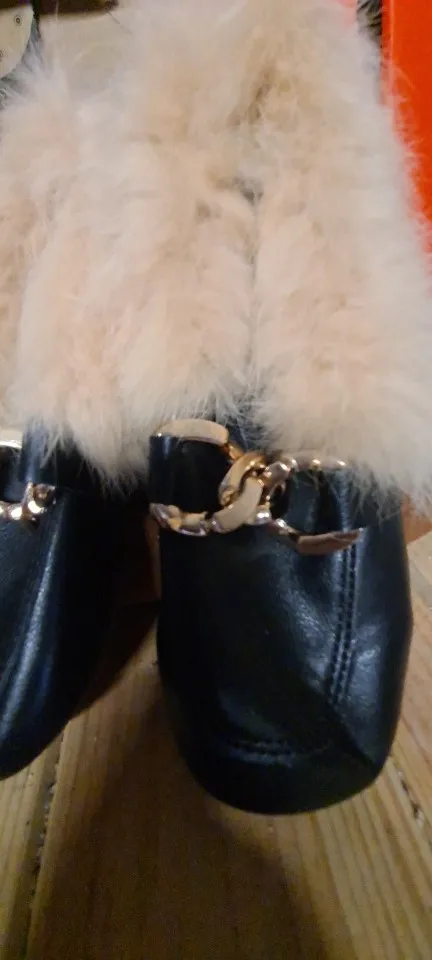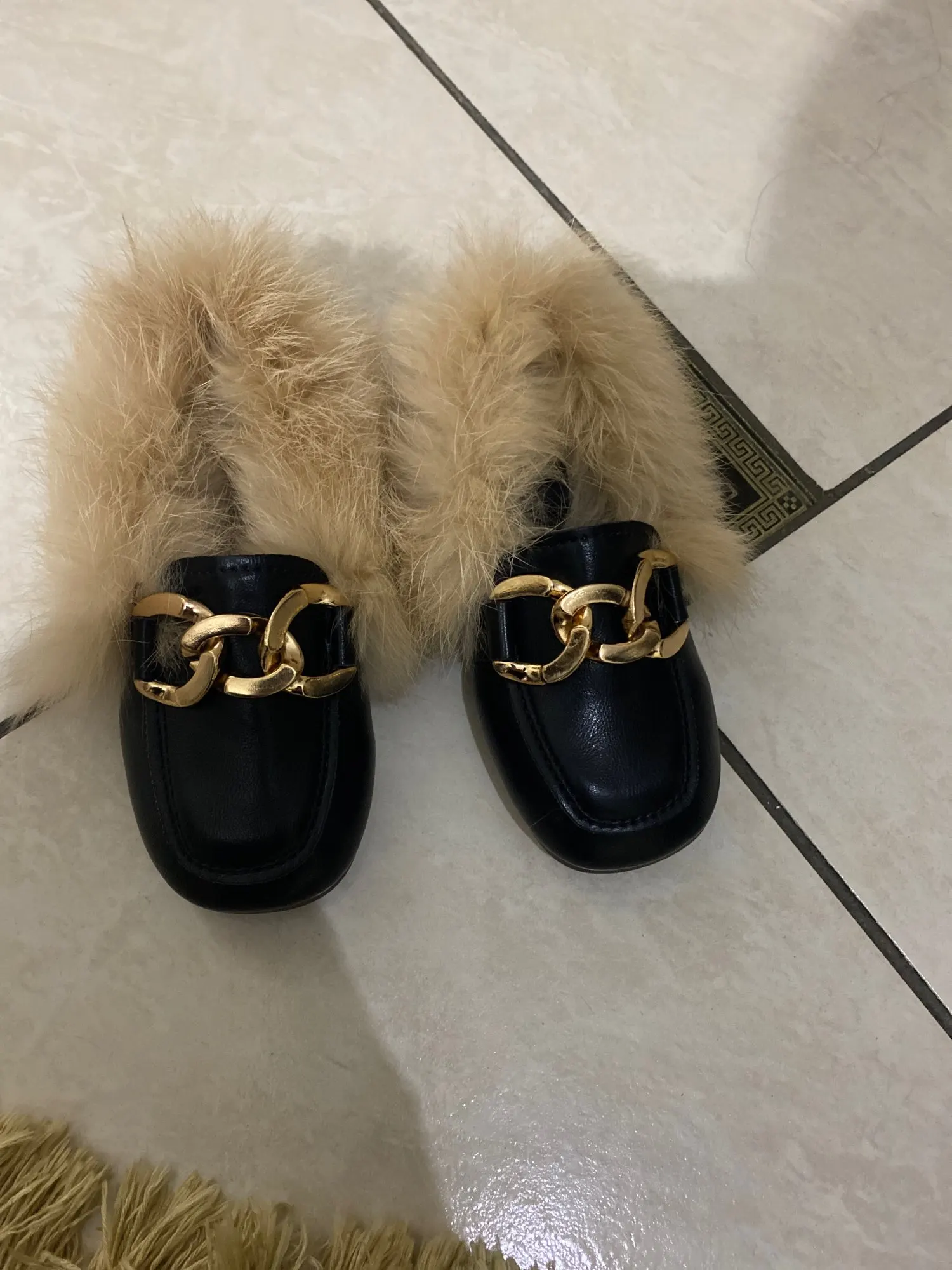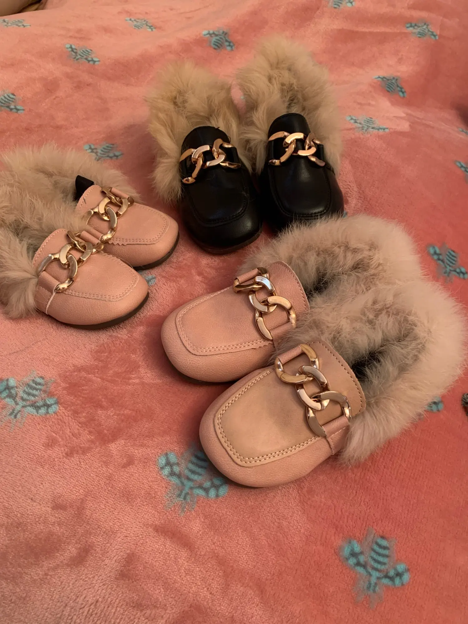 JGVIKOTO-zapatos de otoño e invierno para niñas, mocasines cálidos de algodón con Oso de felpa esponjoso de piel para niños con cadena de Metal, mocasines planos para niños