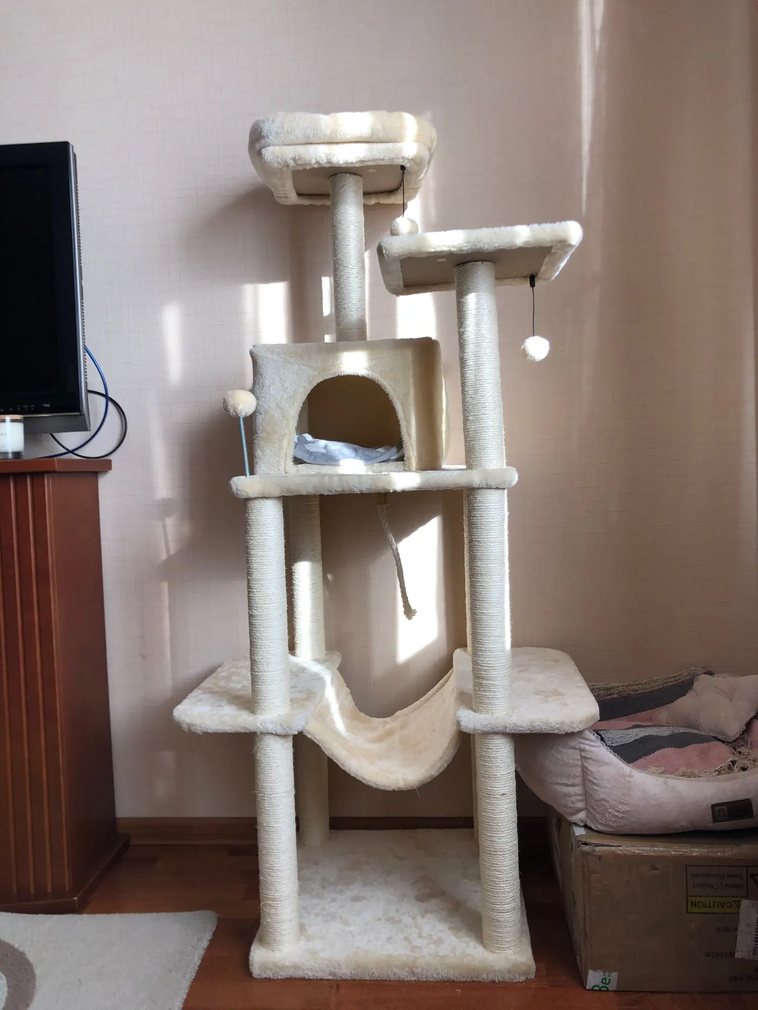 producto fantástico les ha encantado a mis dos gatos es muy grande y no lo he podido poner donde pensaba pero le he hecho hueco en otro sitio porque merece la pena, le fastidia tener que pagar los gastos de envío pero realmente ha merecido la pena puesto que el rascador es de la misma calidad que el que venden en tiendas de animales como kiwoko por el doble de precio os adjunto foto ademas el envío súper rápido y con instrucciones muy claras para montaje.