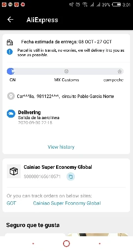 el servicio malo tanto del vendedor como de AliExpress, ya que a penas termina el tiempo se auto asigna el que el cliente ya recibio el producto, cosa que jamás paso, es la segunda vez que me ocurre, ojalá pronto corrijan esa falla
